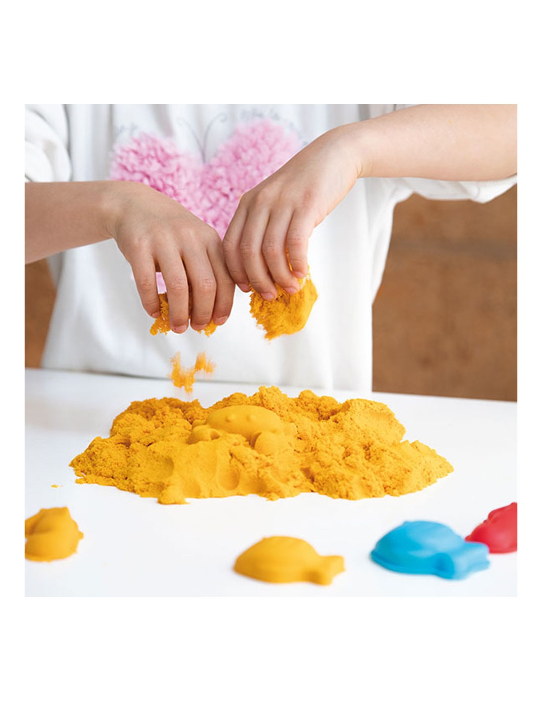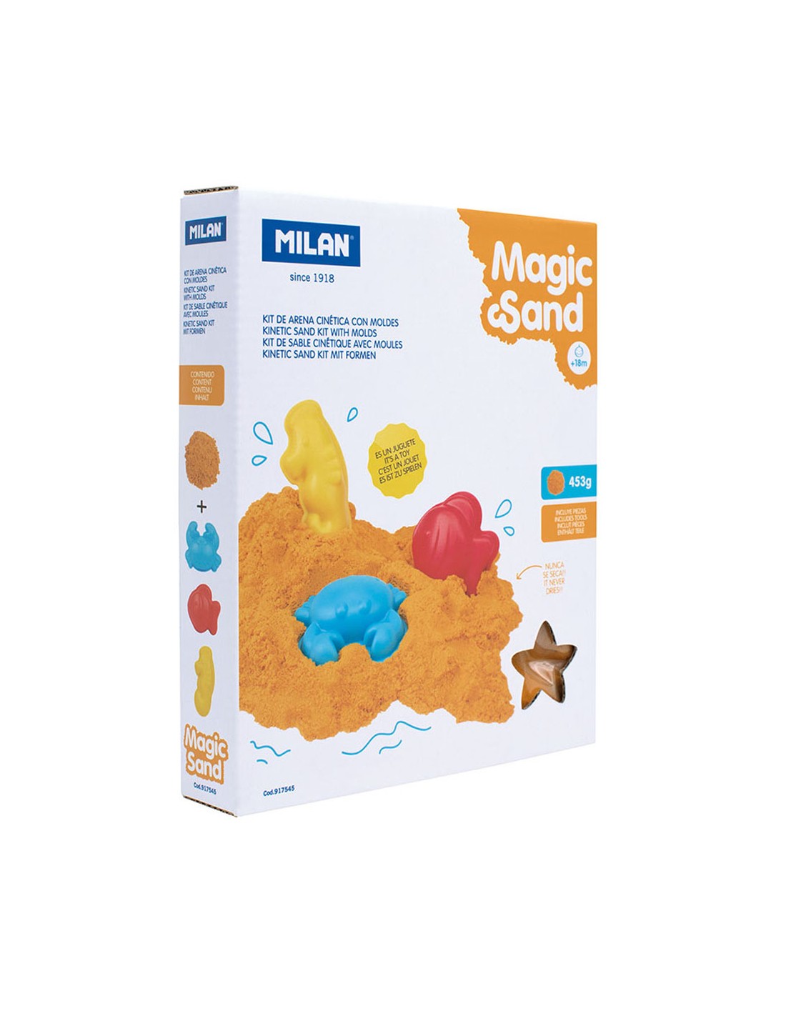 Kit de arena cinética "magic sand" con moldes milan. arena cinética especial para niñas y niños a partir de 18 meses. húmeda y fácilmente manejable, para crear formas con gran definición con los 3 moldes incluidos. ingredientes: 94% de arena, silicona, vaselina y colorante alimentario. nunca se seca. bolsa de 453g