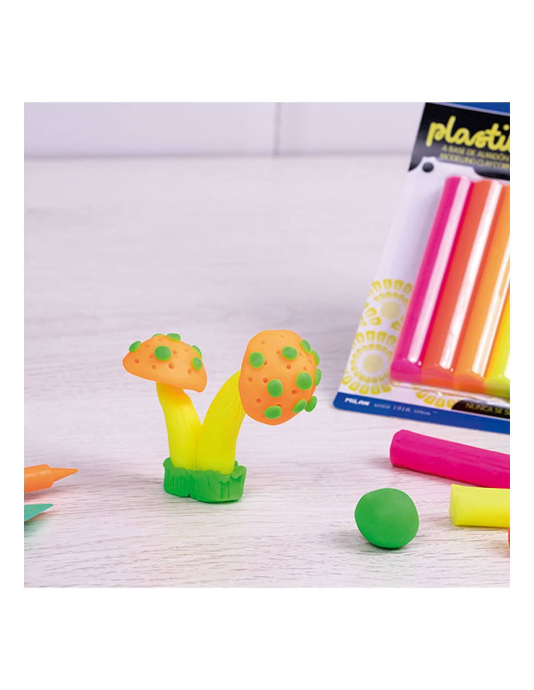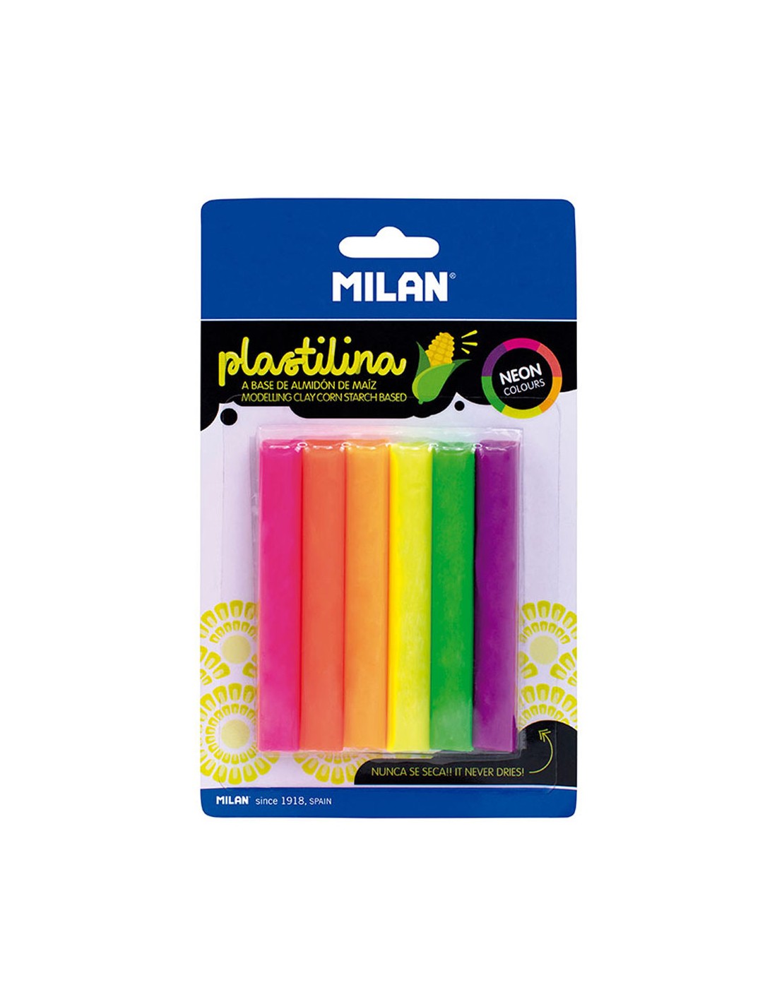 Blíster con 6 barritas de plastilina de colores de fluorescentes 70g milan. 6 barritas de plastilina de colores fluorescents a base de almidón de maíz (sin gluten). fácilmente moldeable, se mantiene suave y no se seca en el envase original. colores rosa, coral, naranja, amarillo, verde y violeta. peso aproximado de cada barra 11g colores mezclables.