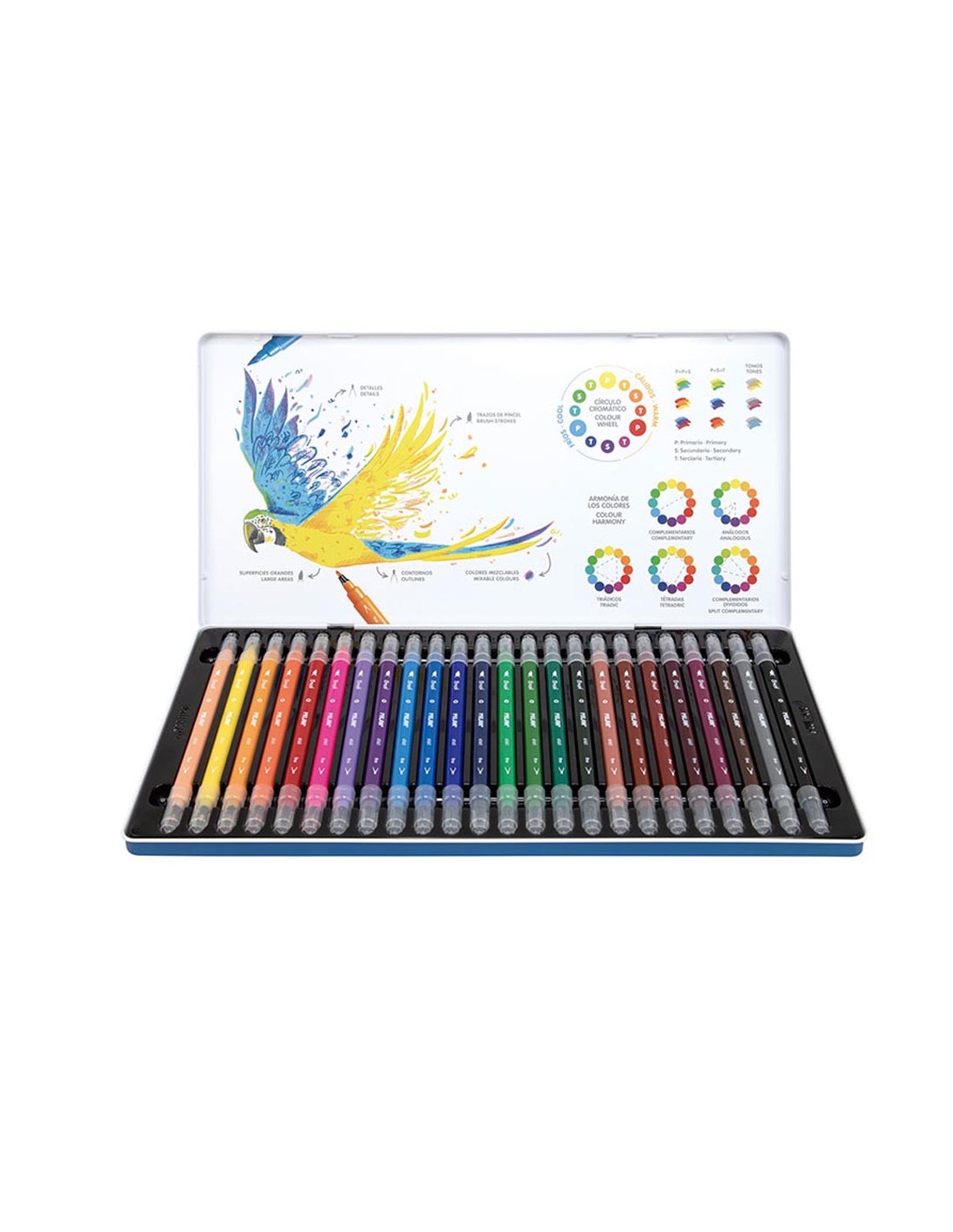 Caja metálica con 24 rotuladores de doble punta fina - pincel milan. rotuladores de doble punta en 24 colores. la punta pincel ofrece un trazo de pincel desde 0,5mm a 4mm. ideal para caligrafía y pintar con distintos trazos mezclando sus colores. punta de fibra. la punta fina de 2mm ø es especialmente adecuada para perfilar y escribir con trazos finos. tinta a base de agua que proporciona unos colores brillantes de fácil aplicación y mezclables entre sí. puede lavarse fácilmente sobre la mayoría de tejidos (poner la prenda en remojo en agua fría durante una hora y lavar a máquina, también con agua fría). con capuchón de seguridad ventilado. estuche metálico con guía cromática interior.