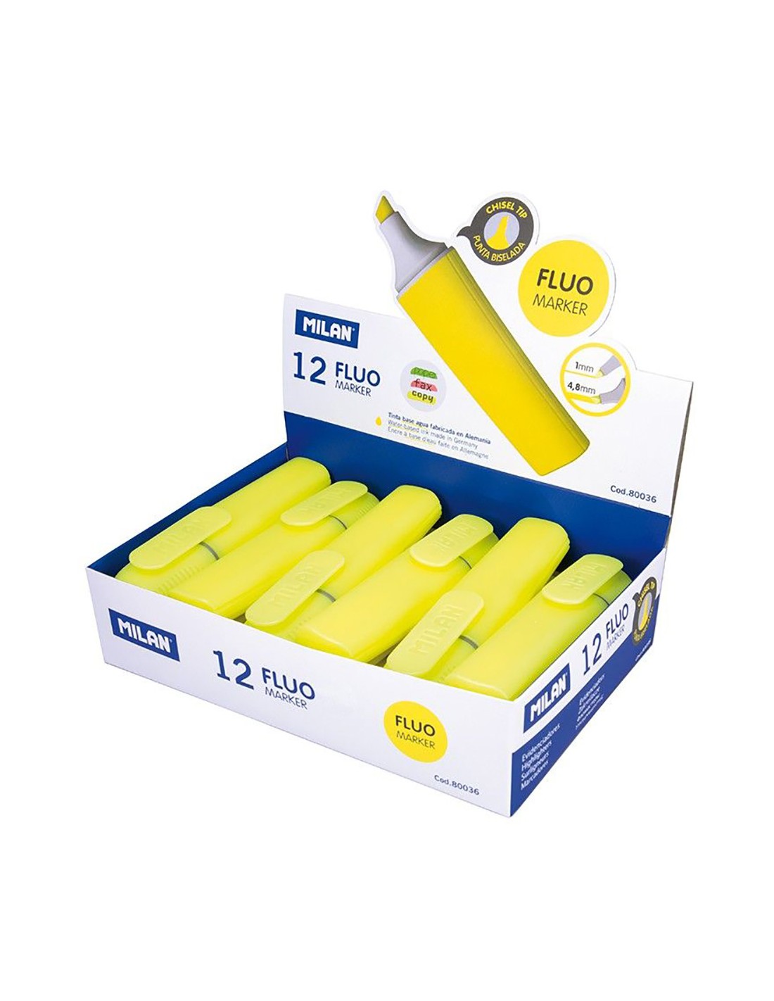 Caja expositora con 12 marcadores fluorescentes color amarillo milan. rotuladores fluorescentes color amarillo. punta biselada 1 - 4,8mm. para subrayar y resaltar sobre papel, fotocopias o papel térmico.