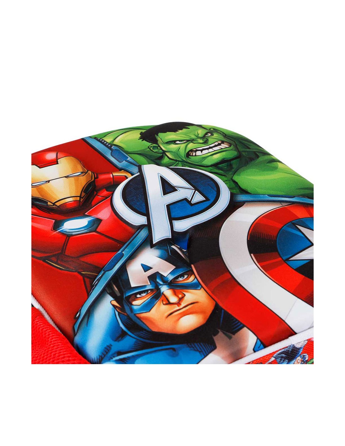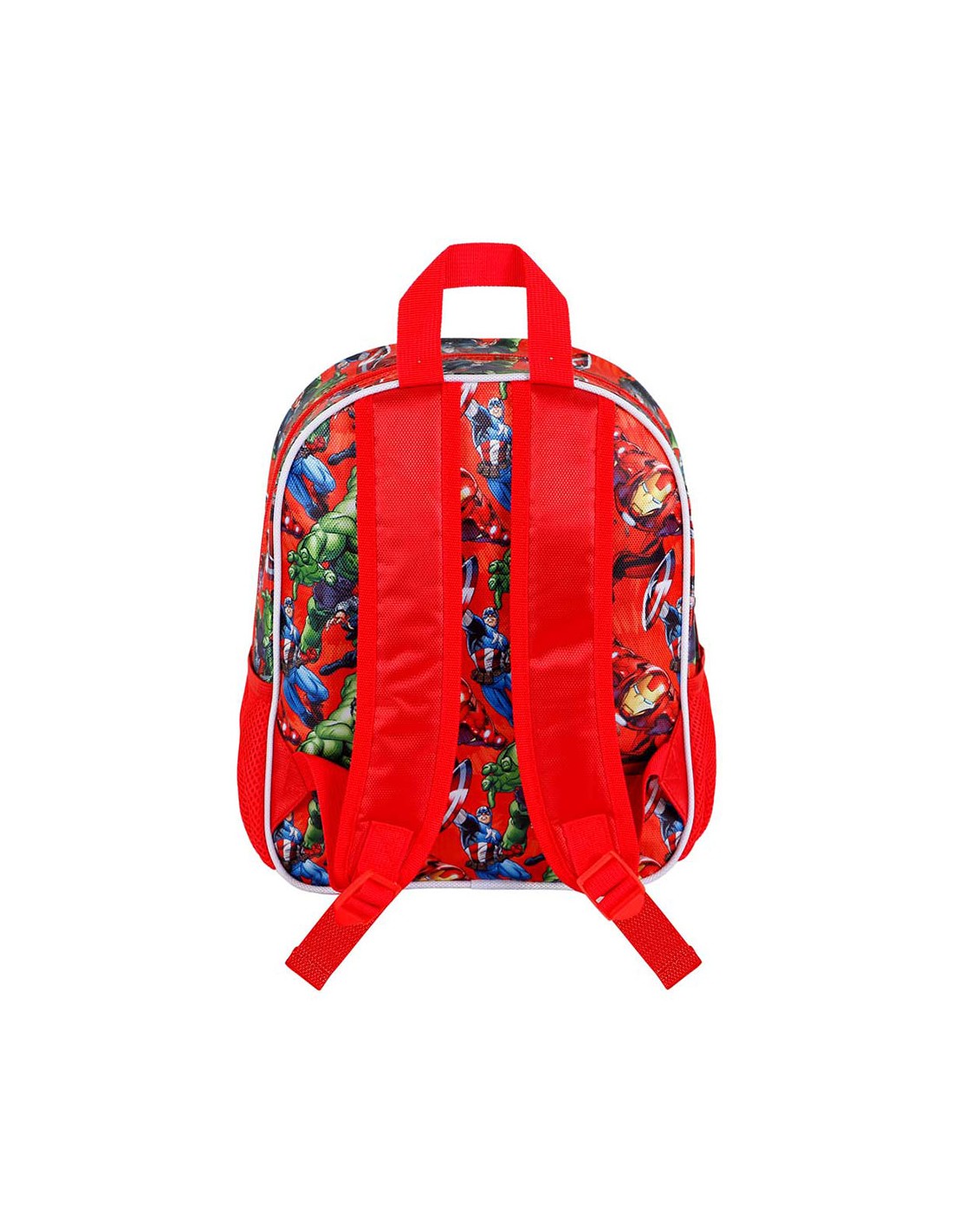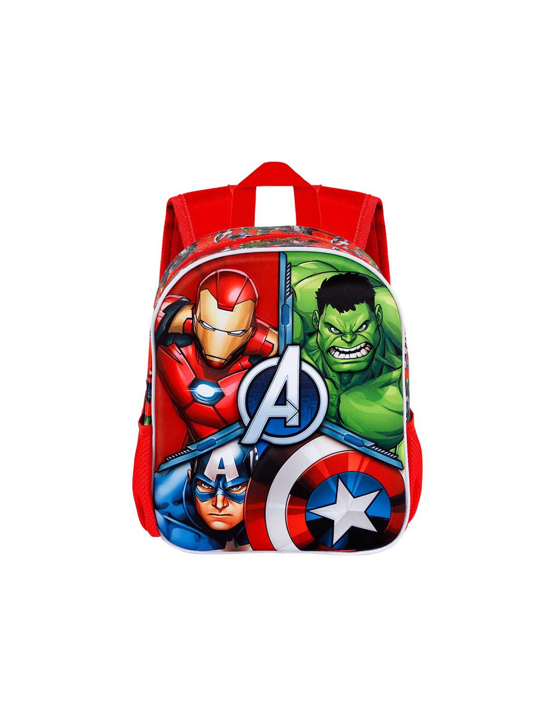 Mochila preescolar con relieve frontal 3d, los vengadores, compartimento principal con cremallera y forro interior, dos bolsillos laterales de malla, medidas: 26x11x31cm. capacidad 8,5 l. karactermania