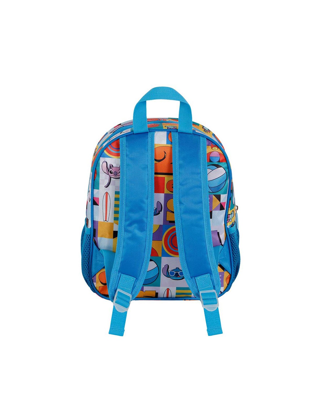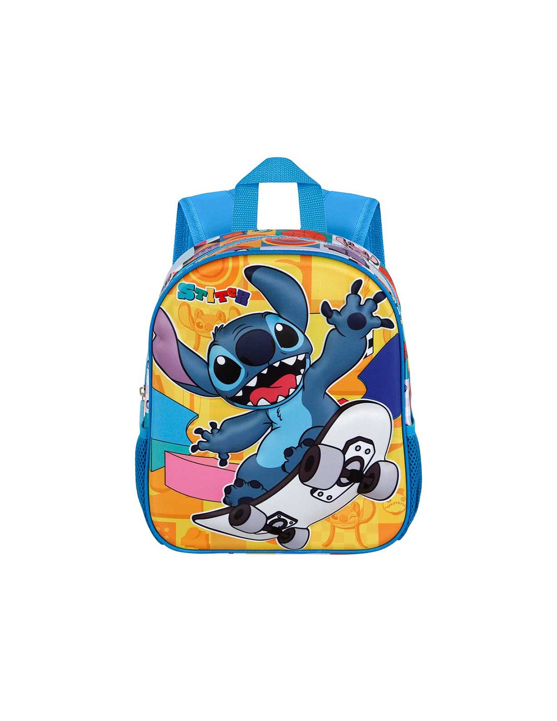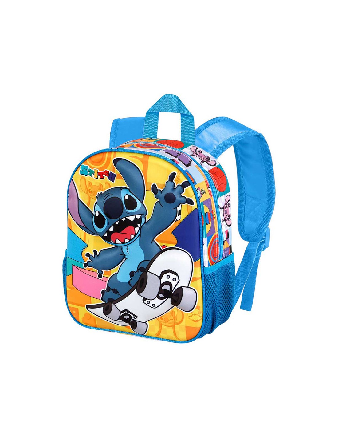 Mochila preescolar con relieve frontal 3d, lilo y stitch skater, compartimento principal con cremallera y forro interior, dos bolsillos laterales de malla, medidas: 26x11x31cm. capacidad 8,5 l. karactermania