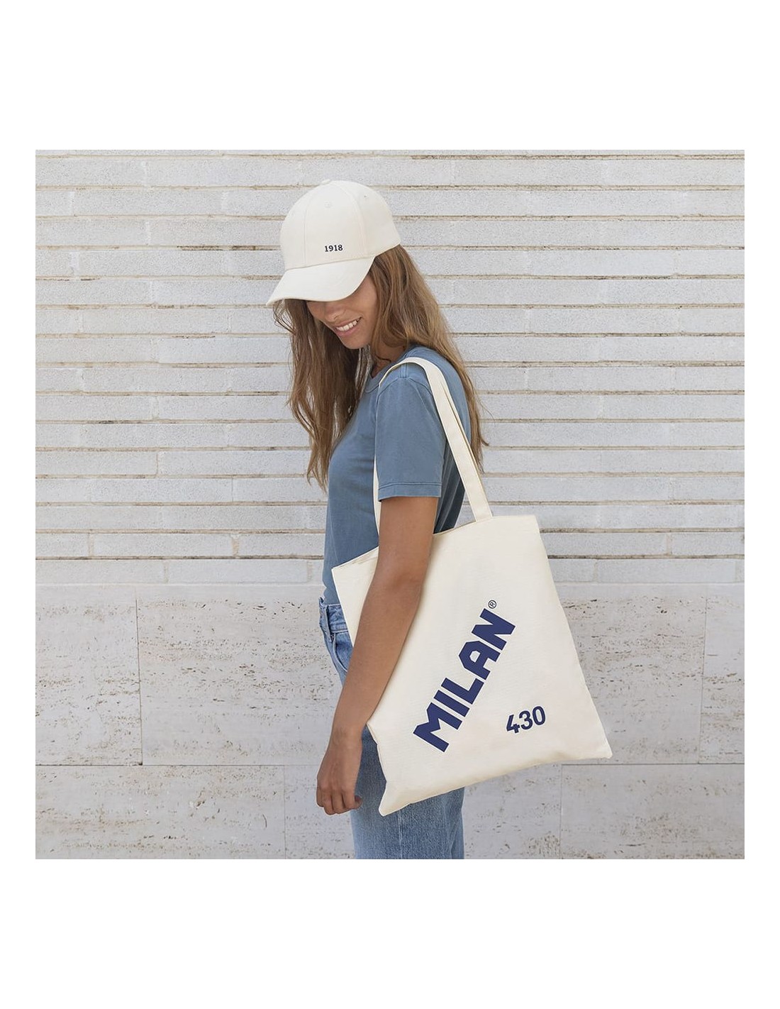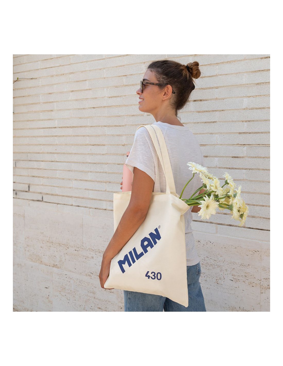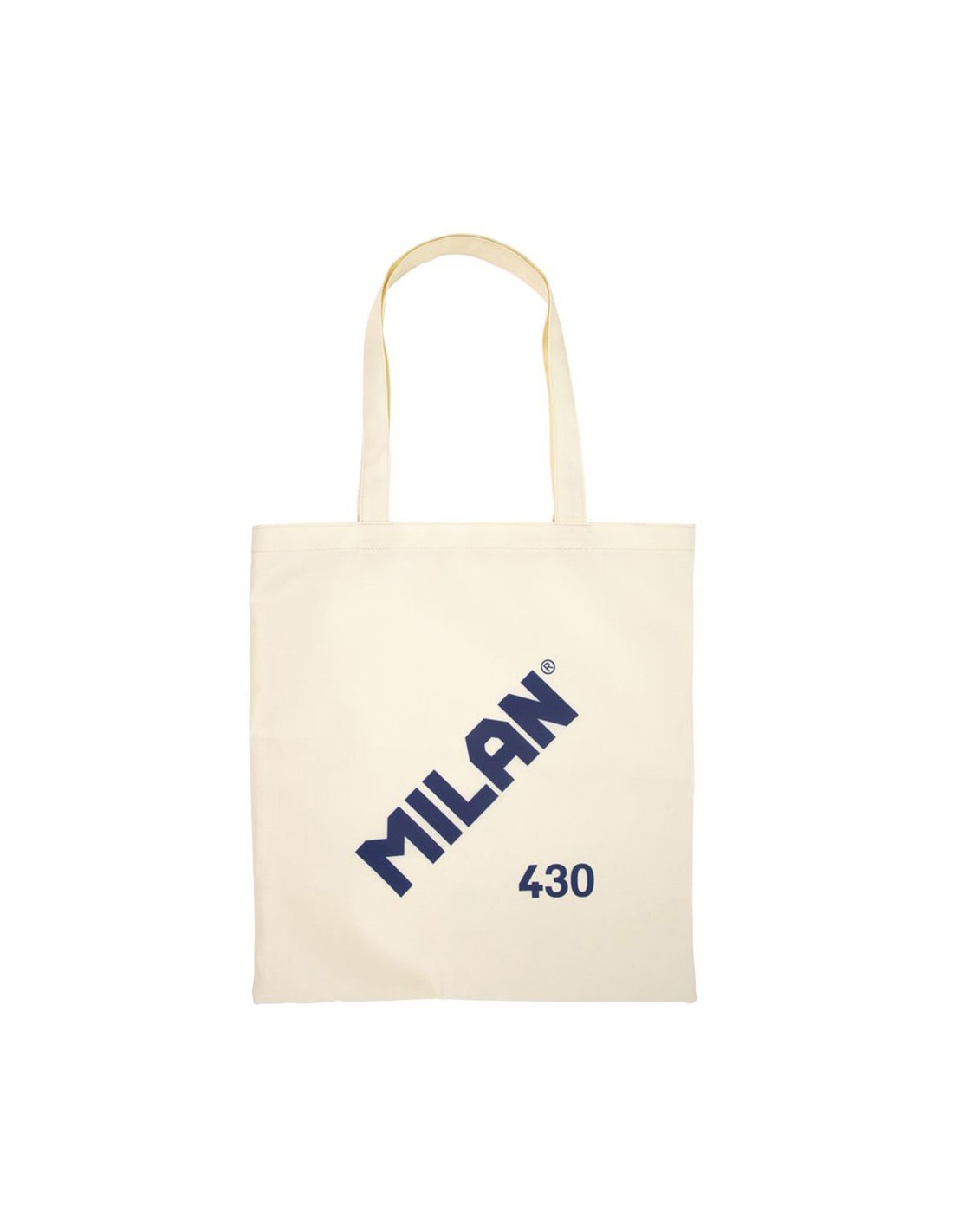 Bolsa de tela tote bag color beige. colección 430 since 1918, colores y diseño originales de las gomas de borrar milan, fabricadas en españa desde 1918. ideal para la compra, bolso o para llevar lo necesario para el día a día. tejido 'ripstop': ligero y resistente a la rotura y rasgaduras. composición polyester. medidas 0,5x38x41cm. largo asa 27cm. capacidad 12,6 litros.