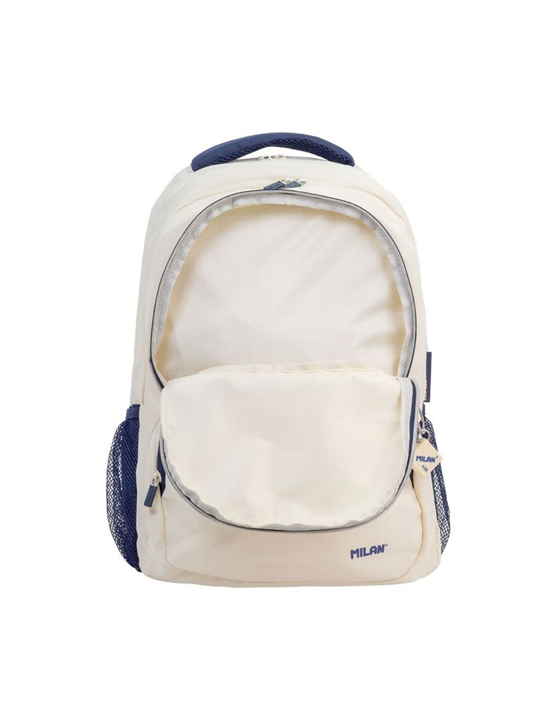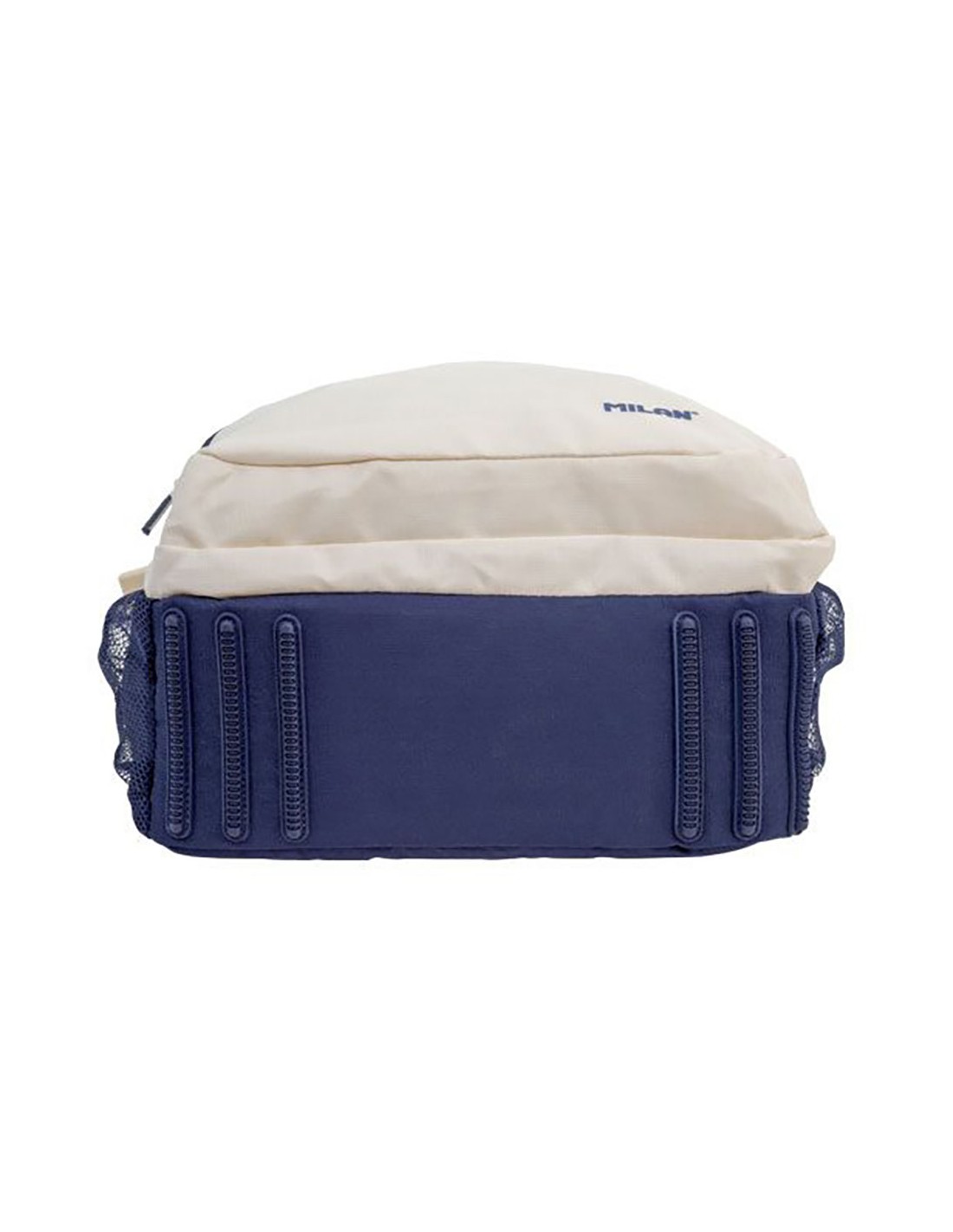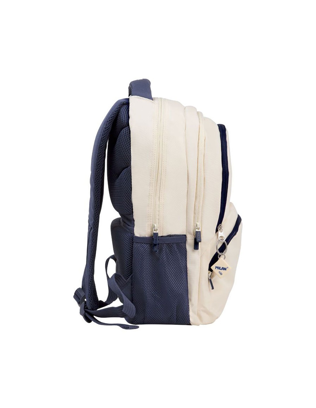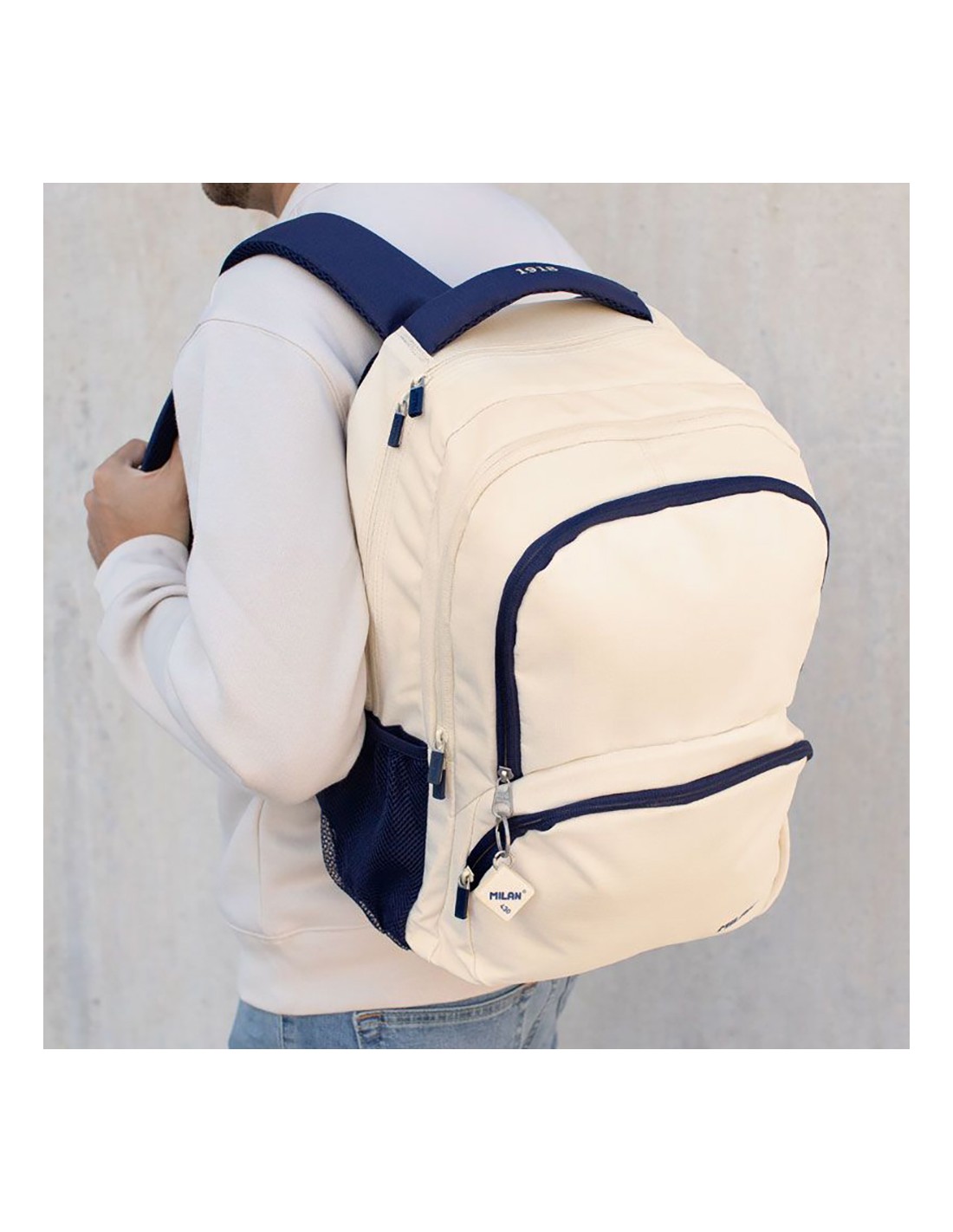 Mochila escolar con 4 cremalleras, color beige y azul marino. colección 430 since 1918. un bolsillo principal con compartimento interior protector para portátil. 3 bolsillos delanteros, 2 bolsillos laterales de malla de fácil acceso. asas regulables, parte posterior acolchada y transpirable, base reforzada. permite añadir un carrito porta-mochilas. el bolsillo delantero incluye un llavero de la goma 430 en el tirador de la cremallera. forro interior estampado con una cuadrícula que evoca las formas de las gomas milan. tejido exterior 'ripstop': ligero y resistente. composición tejido exterior y forro interior de poliéster. medidas 46,5x30x17cm. capacidad 25 litros.