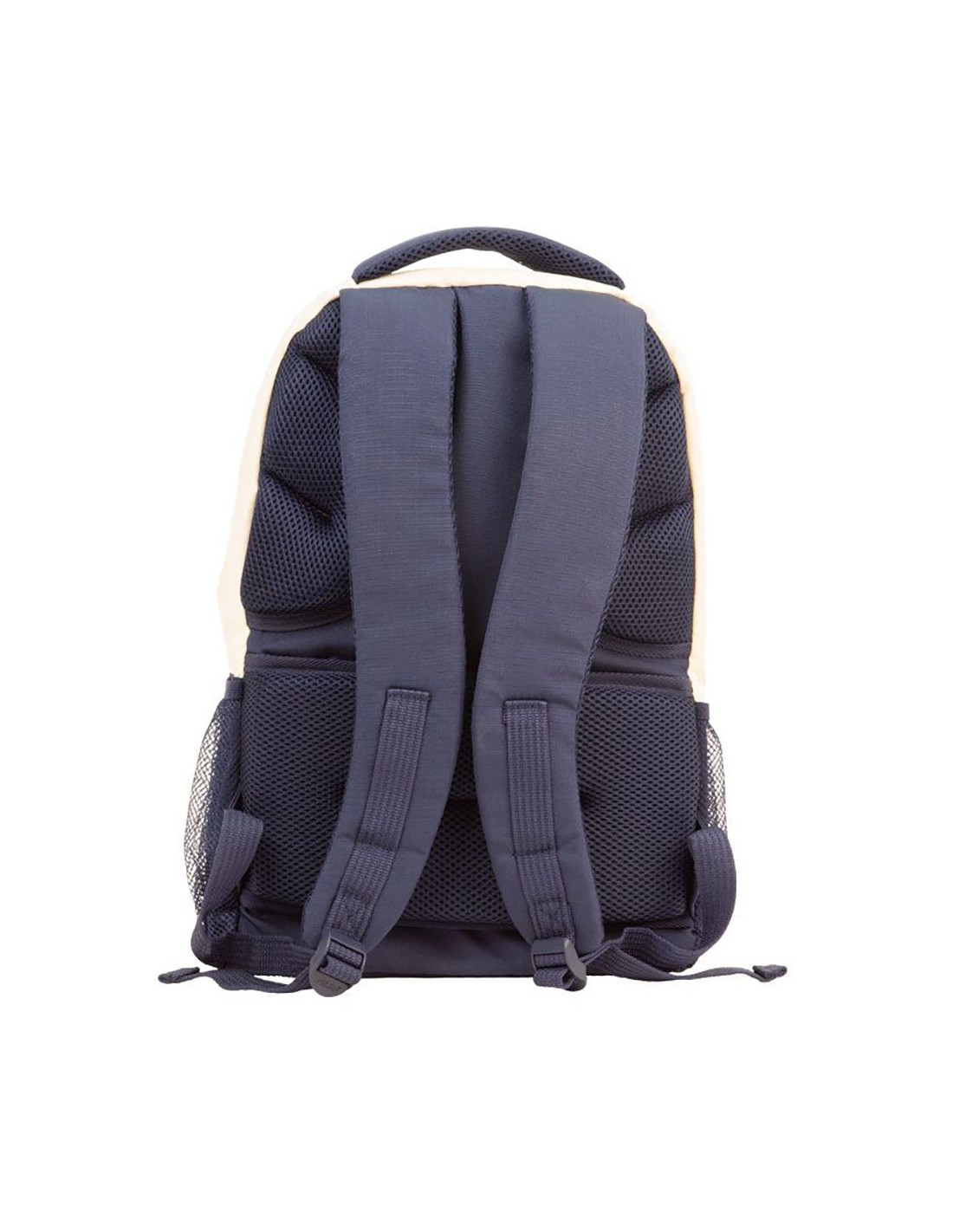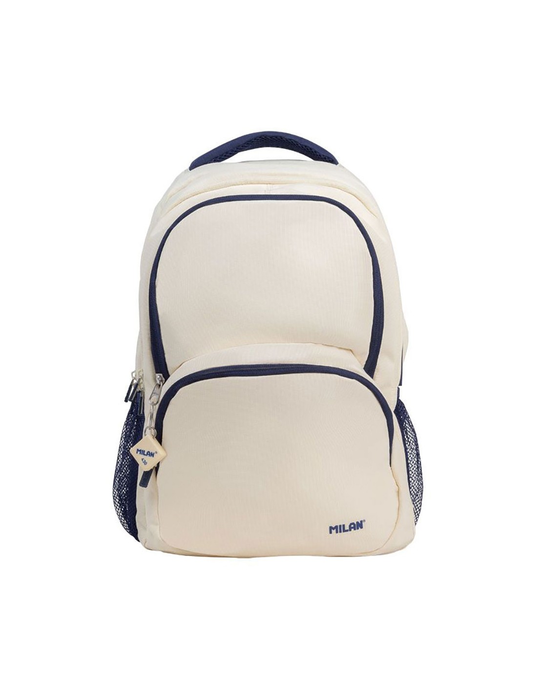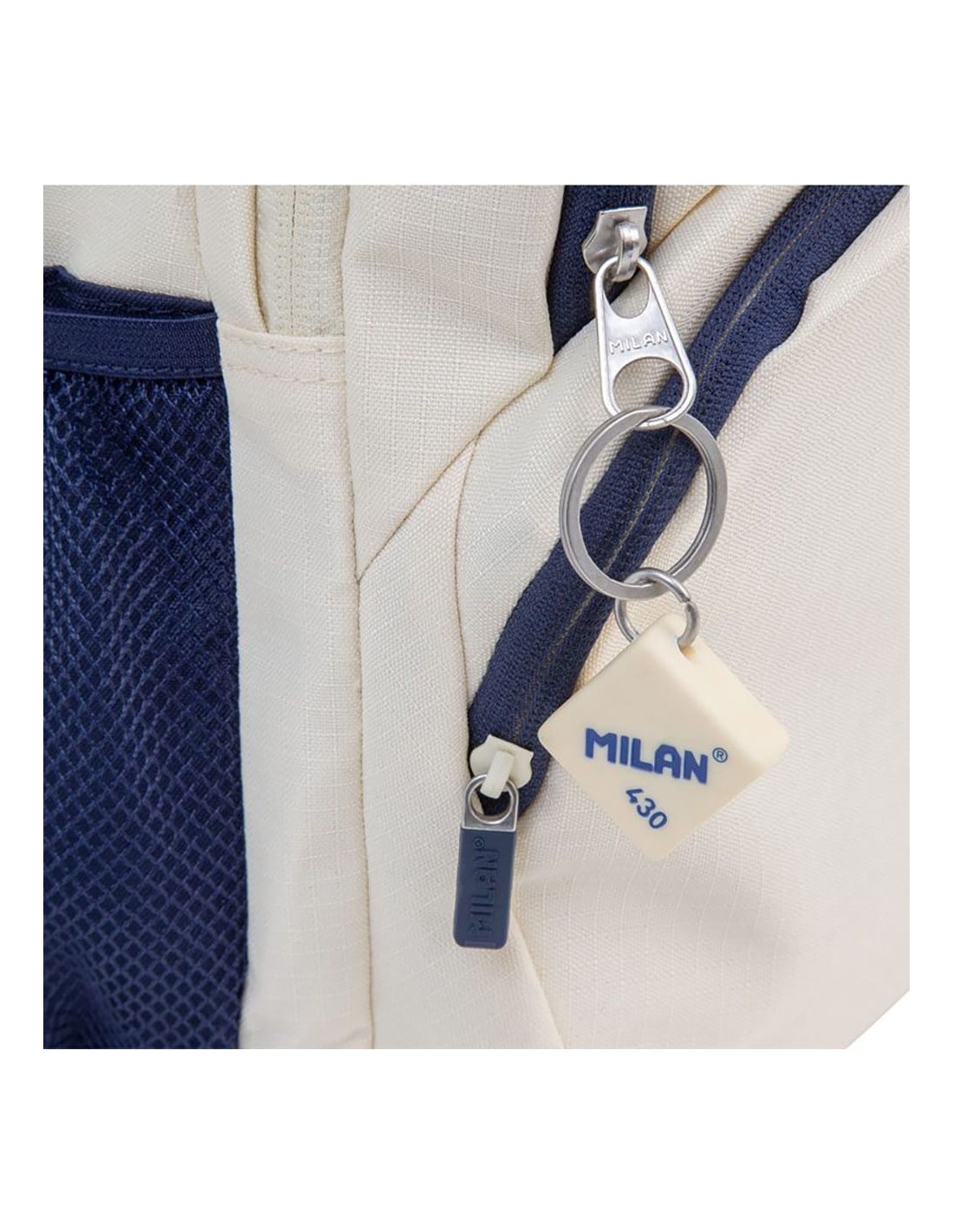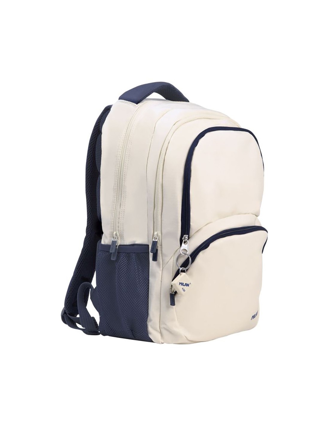Mochila escolar con 4 cremalleras, color beige y azul marino. colección 430 since 1918. un bolsillo principal con compartimento interior protector para portátil. 3 bolsillos delanteros, 2 bolsillos laterales de malla de fácil acceso. asas regulables, parte posterior acolchada y transpirable, base reforzada. permite añadir un carrito porta-mochilas. el bolsillo delantero incluye un llavero de la goma 430 en el tirador de la cremallera. forro interior estampado con una cuadrícula que evoca las formas de las gomas milan. tejido exterior 'ripstop': ligero y resistente. composición tejido exterior y forro interior de poliéster. medidas 46,5x30x17cm. capacidad 25 litros.
