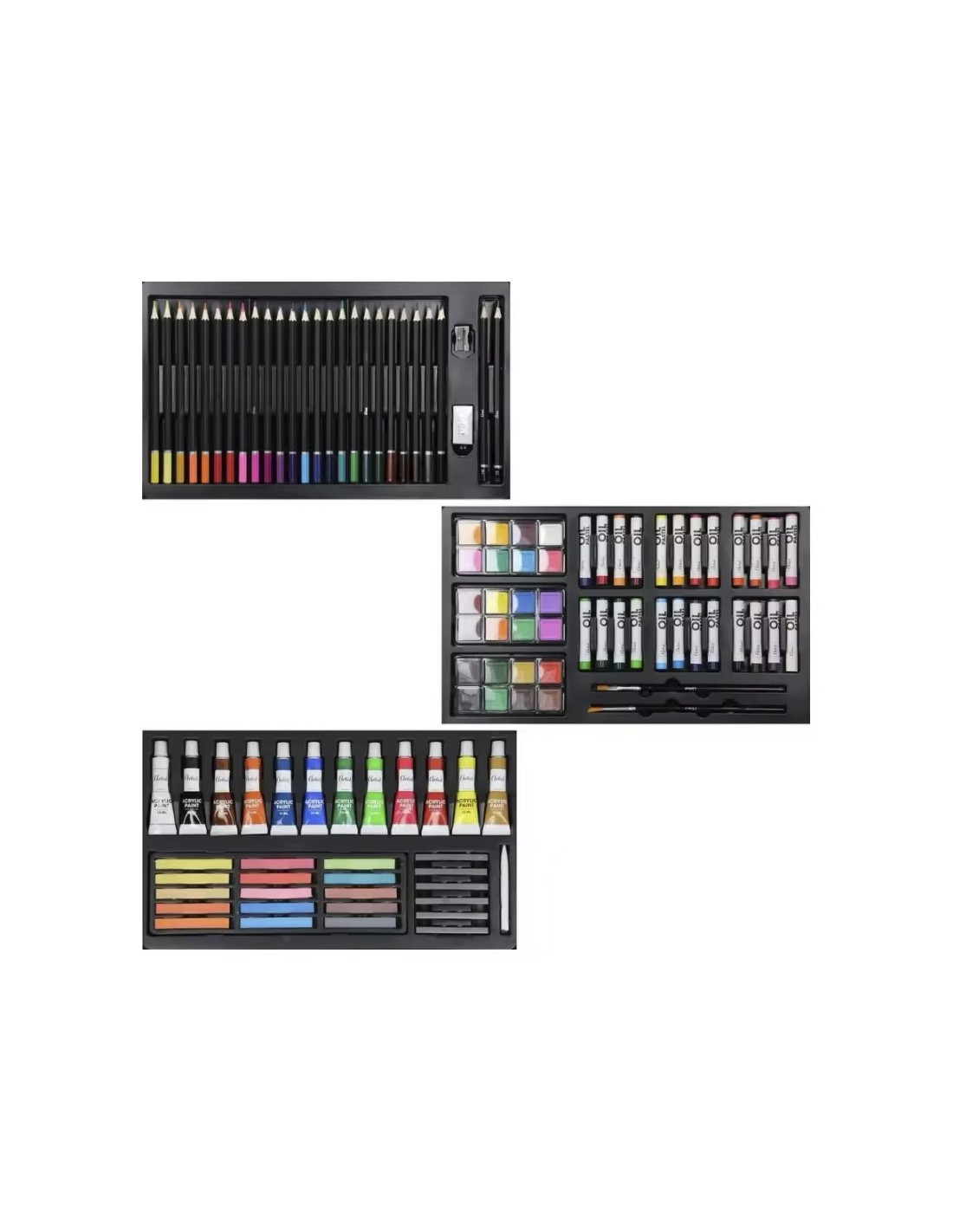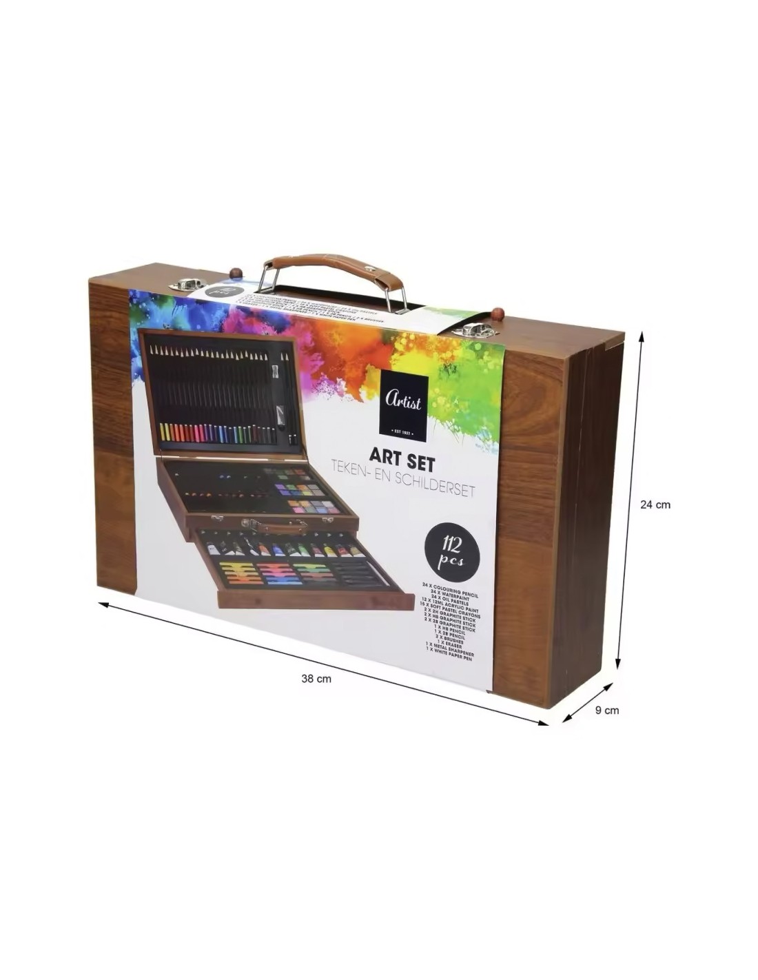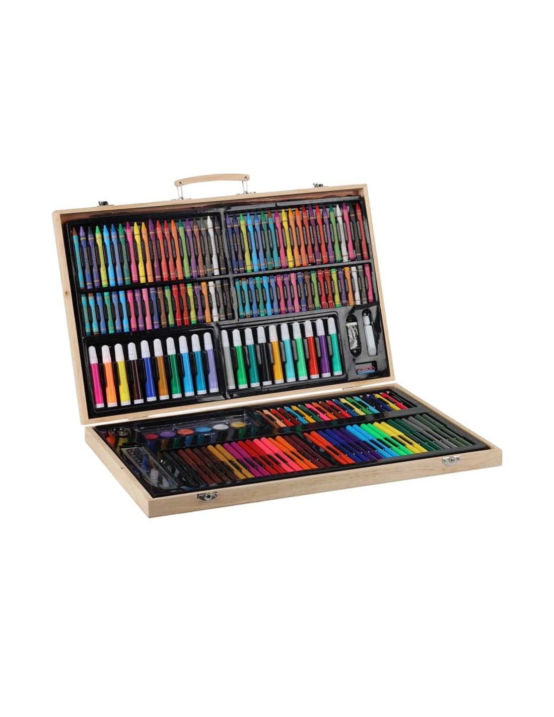 Set maletín arte madera 20 lápices de colores, 20 rotuladores punta gorda, 36 rotuladores punta fina, 12 colores de aquarelas, 40 crayones, 40 crayones oil pastel, 1 borrador, 1 sacapuntas, 1 regla de 15 cm, 1 lápiz, 1 pincel, 4 clips y pegamento