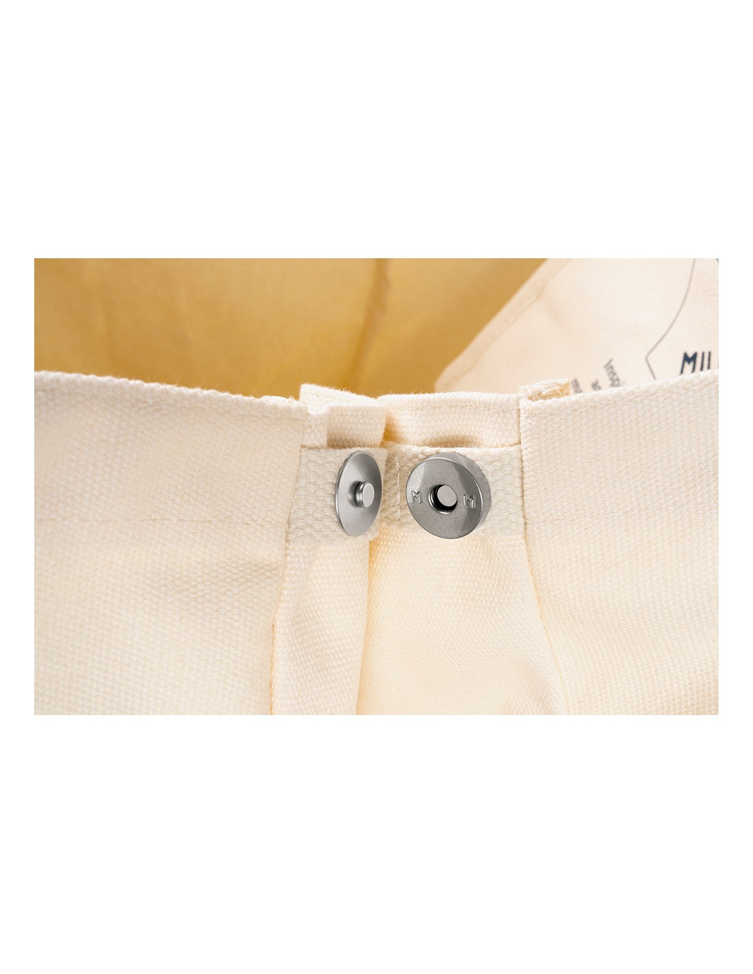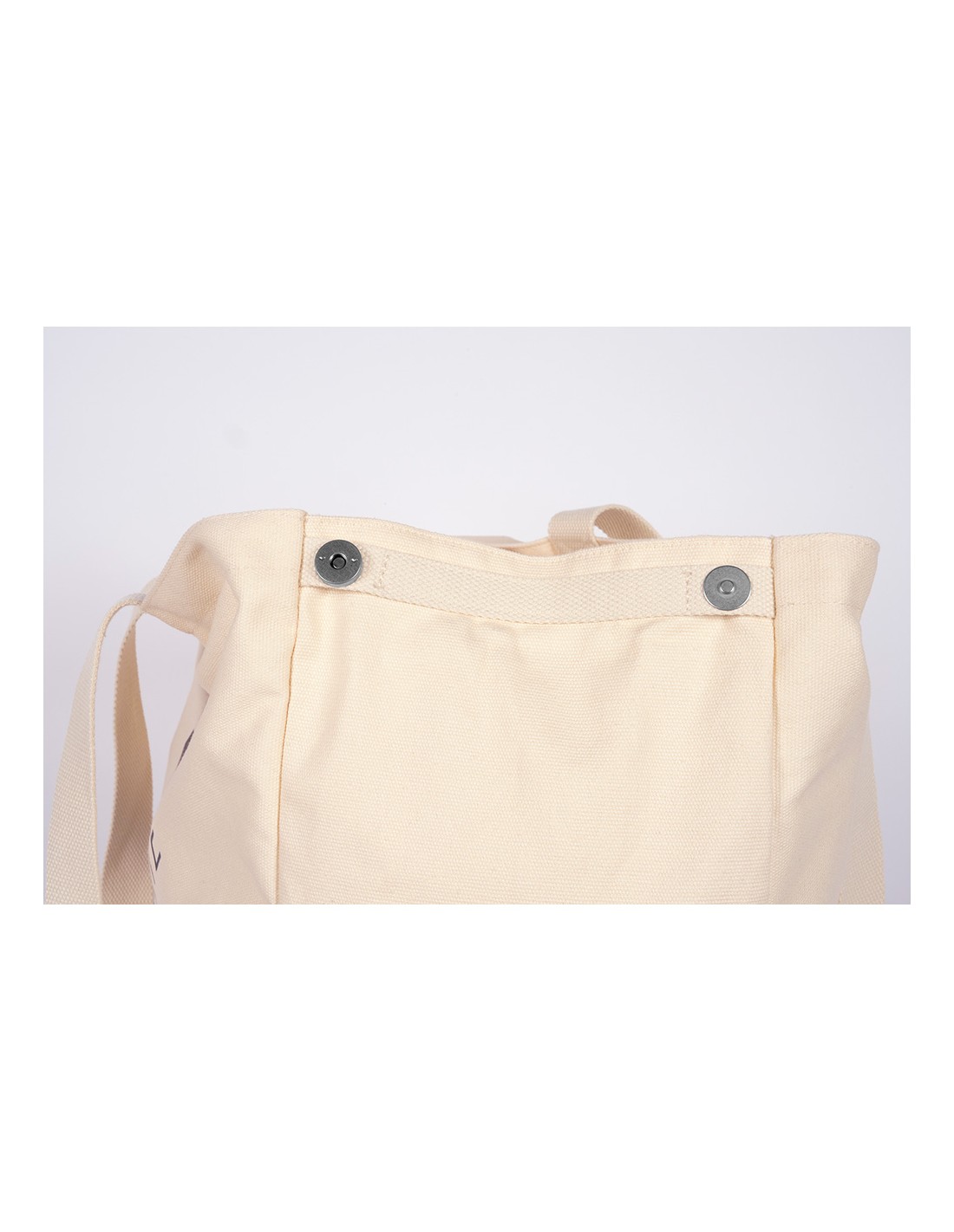 Bolso tote bag de gran capacidad de color beige, perfecto para llevar todas las pertenencias durante el día. cuenta con un amplio compartimento principal, dos bolsillos interiores y una tira para colgar llaves o bolsas. incluye botones magnéticos laterales que permiten ajustar su tamaño según las necesidades. logotipo de la colección de color azul marino. composición del tejido: 100% algodón. lavado a mano máx. 30°, no planchar, no usar secadora, no usar lejía. capacidad: 40 l. medidas: 51 x 40, 5 x 21,5 cm