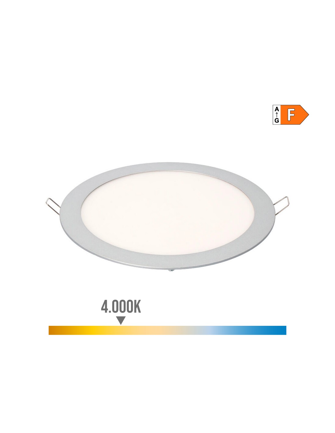 Downlight led empotrable redondo 20 w, luz día, 4000 k, 1500 lm, 90 leds. angulo de apertura 160°. ip20, 220 -240 v~ 50 - 60 hz. ip20. vida estimada: 25.000h. clase energética: f. marco cromado. cristal mate. medidas: exterior: ø22,5cm - enclavamiento: ø20cm.