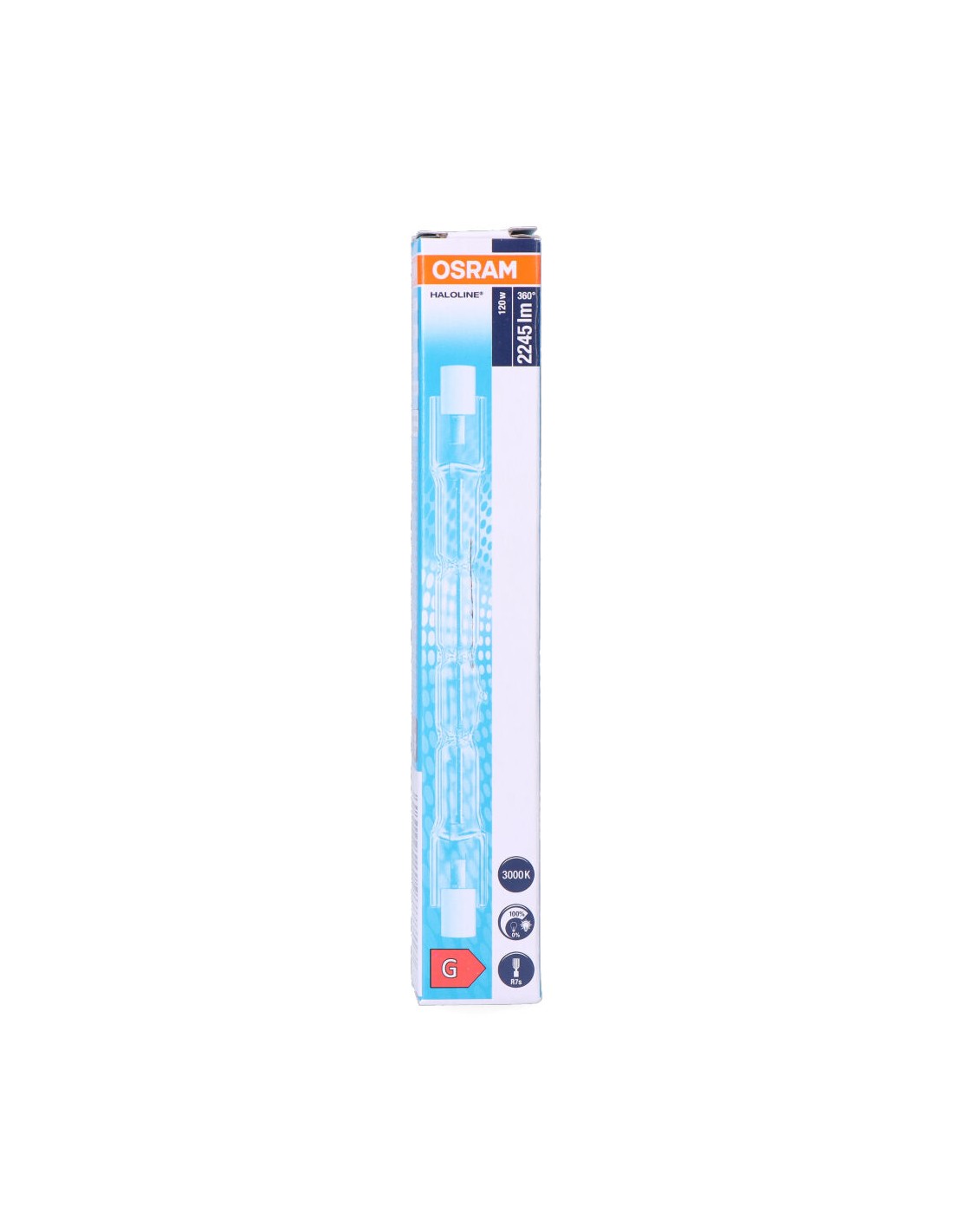 Bombilla halogena lineal 120w. 2245lm. medida: 118mm haloline vida estimada: 2000h. tipo de luz: ultra brillo. angulo de apertura: 360°. dimable. tension: 220-240v osram