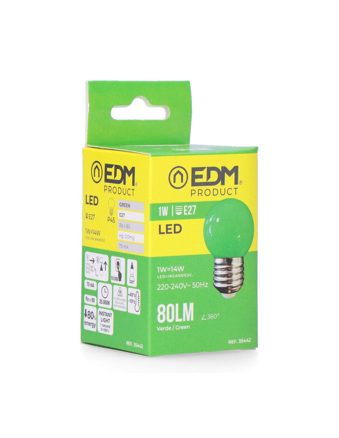 Bombilla esferica led e27 1w 80lm luz verde ø45x69mm 25000h ac 220-240v clase energetica: f angulo de apertura: 220° edm