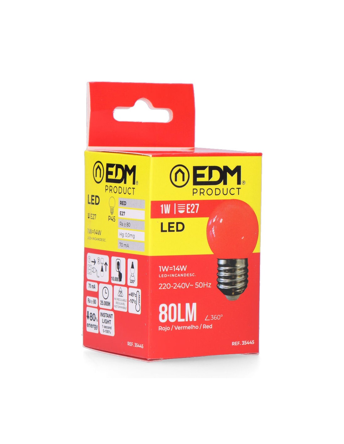 Bombilla esferica led e27 1w 80lm luz roja ø45x69 mm 25000h ac 220-240v clase energetica: f. angulo de apertura: 120° edm
