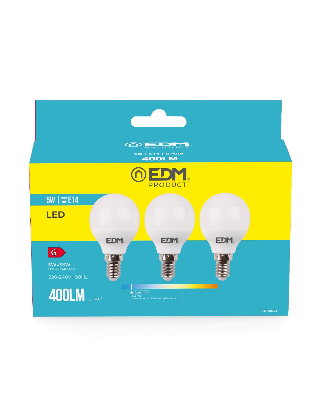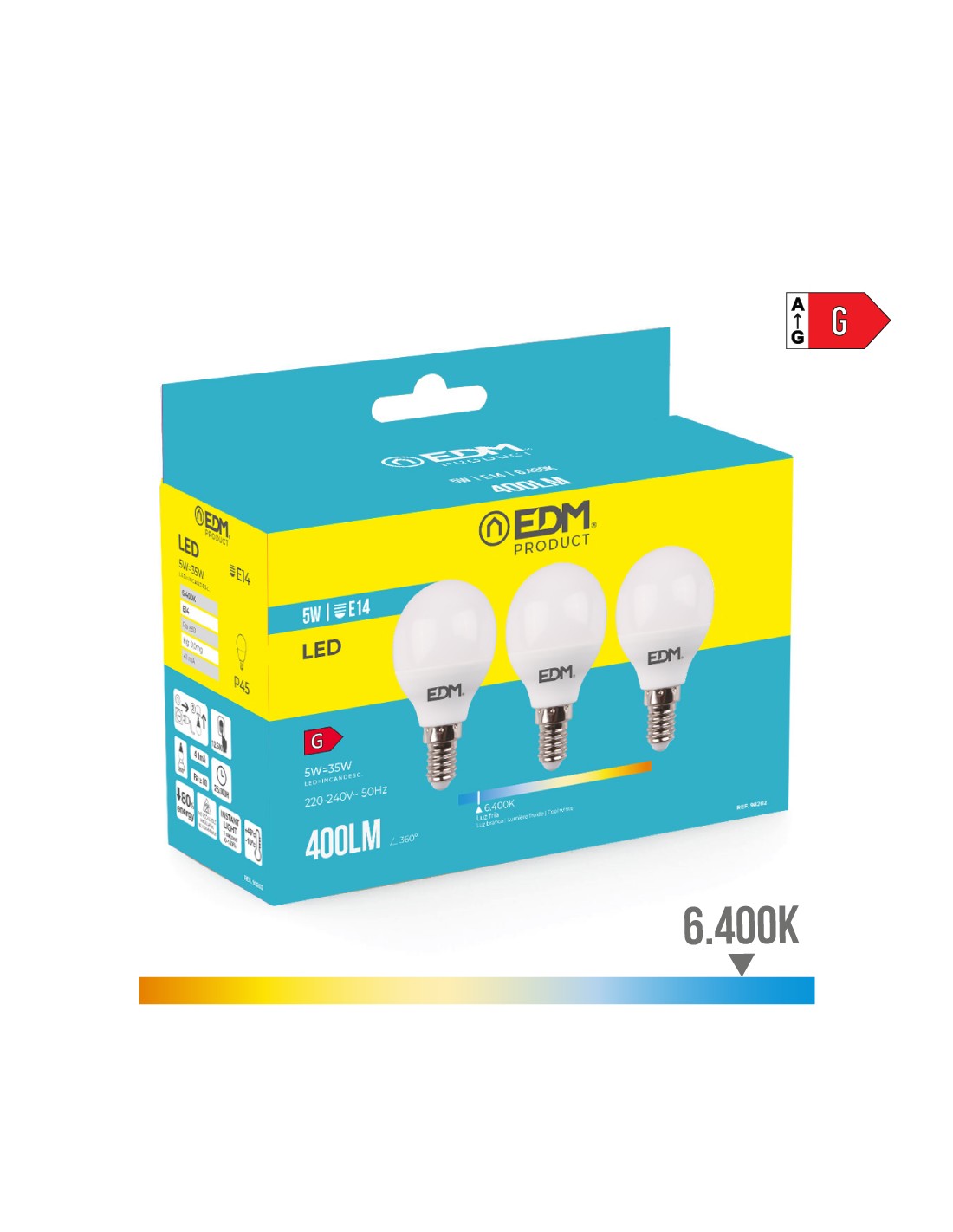 Kit 3 bombillas esfericas led e14 5w 400lm 6400k luz fria ø4,5x8cm (diámetro/alto) 25000h ac 220-240v clase energetica: g. angulo de apertura: 200° edm