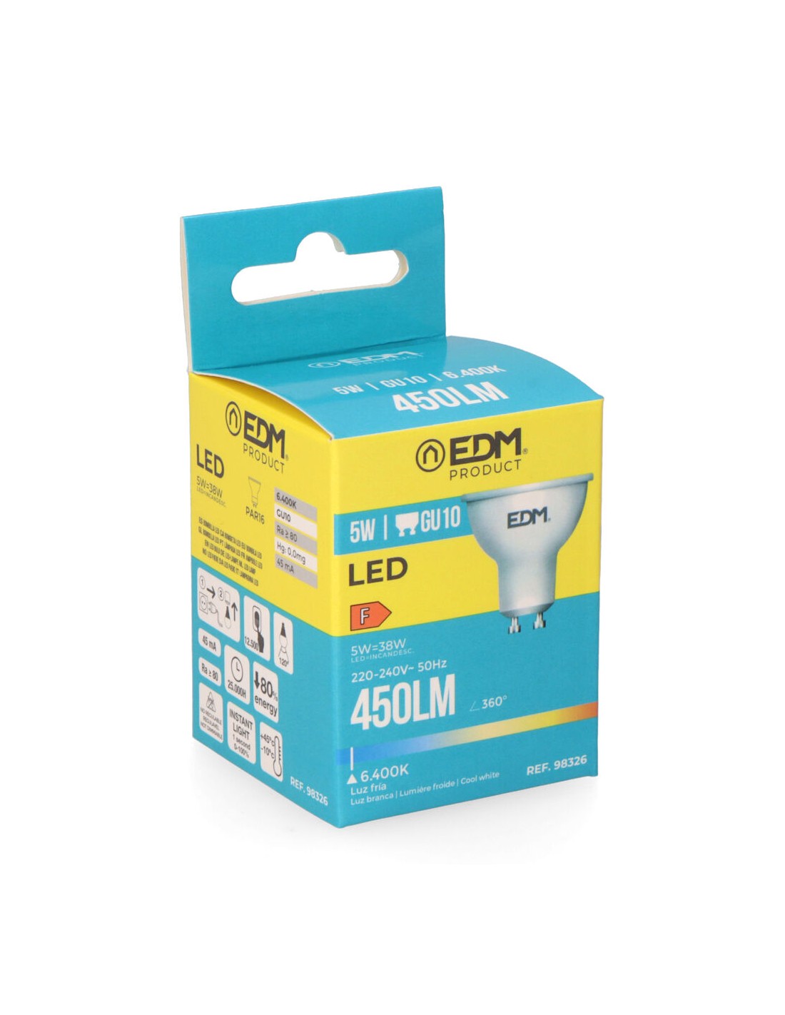 Bombilla dicroica led gu10 5w 450lm 6400k luz fria ø5x5,5cm (diámetro/alto) 25000h ac 220-240v clase energetica: f. angulo de apertura: 120° edm