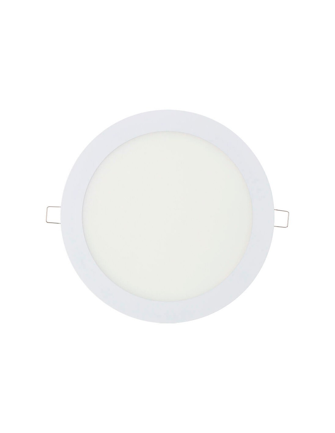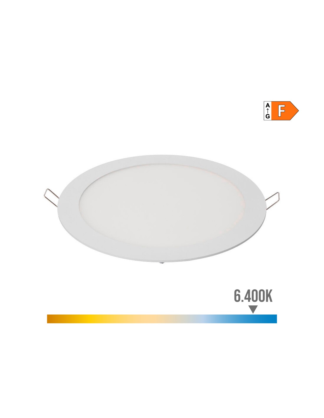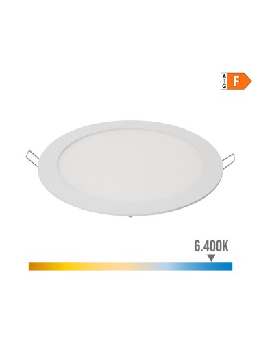 Downlight led empotrable redondo 20 w, luz fría, 6400 k, 1500 lm, 90 leds. flujo luminoso: 360° ángulo de apertura 160° ip20, tensión: 220 - 240 v ~ 50 - 60 hz vida estimada: 25.000 h. clase energética: f. marco blanco. cristal mate. medidas: exterior: ø22,5 cm - enclavamiento: ø20 cm. incluye transformador