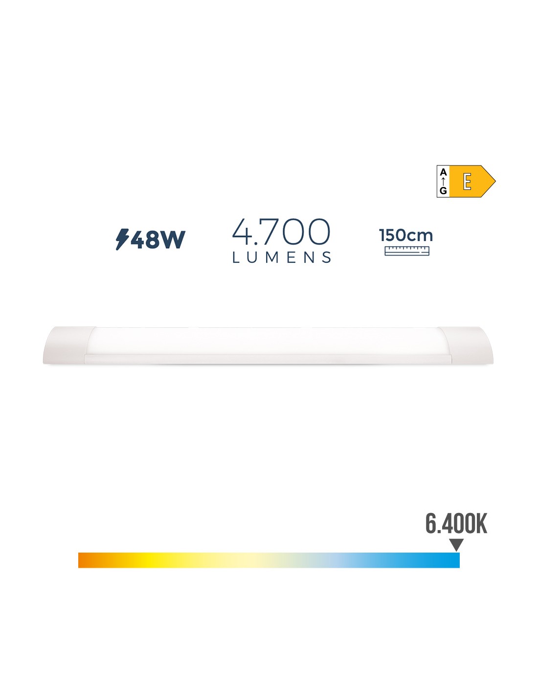 Regleta electronica led 48 w 6500 k luz fria ip20 552 leds 4700 lm angulo de apertura 110°. 220-240 v. medidas: 150 x 3,5 x 12 cm (con soportes) 25.000 h