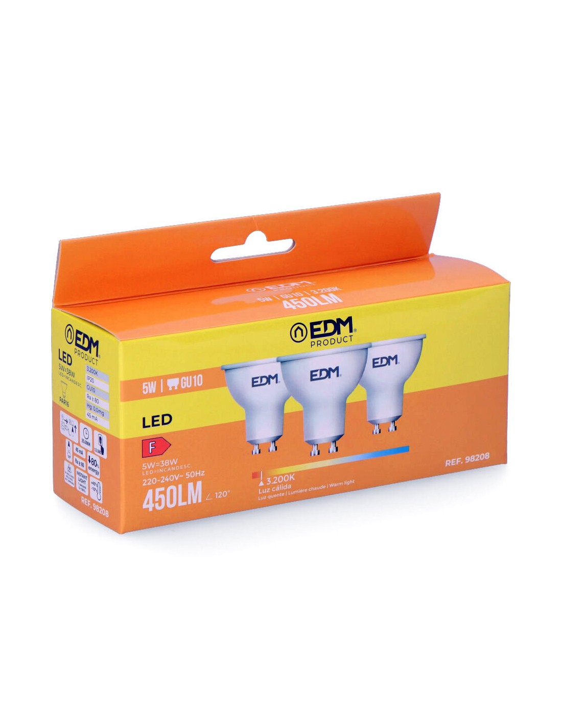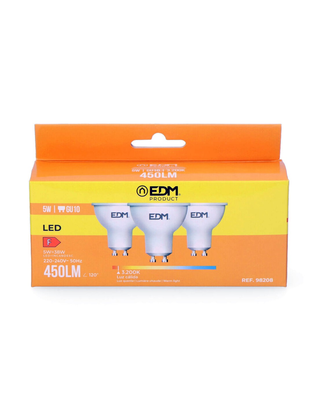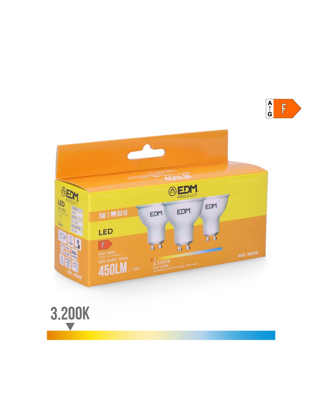 Kit 3 bombillas dicroicas led gu10 5w 450lm 3200k luz calida medidas: ø5x5,5cm (diámetro/alto) 25000h ac 220-240v clase energetica: f. angulo de apertura: 120° edm