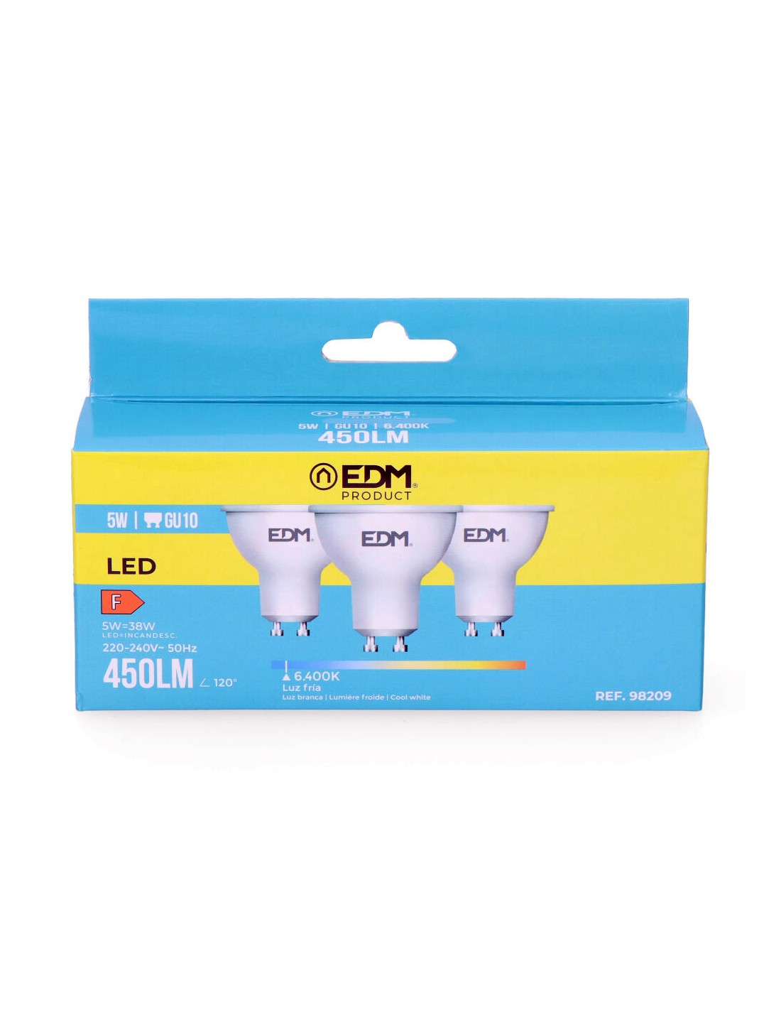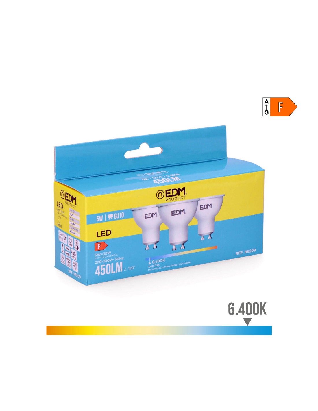 Kit 3 bombillas dicroicas led gu10 5w 450lm 6400k luz fria medidas: ø5x5,5cm (diámetro/alto) 25000h ac 220-240v clase energetica: f. angulo de apertura: 120° edm