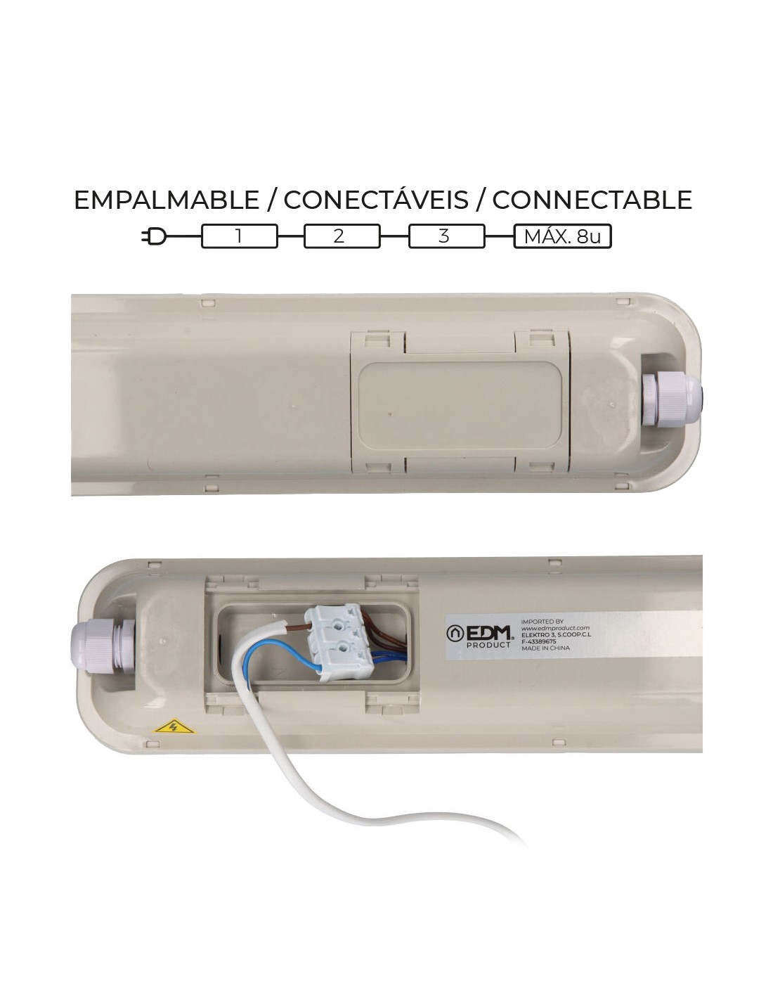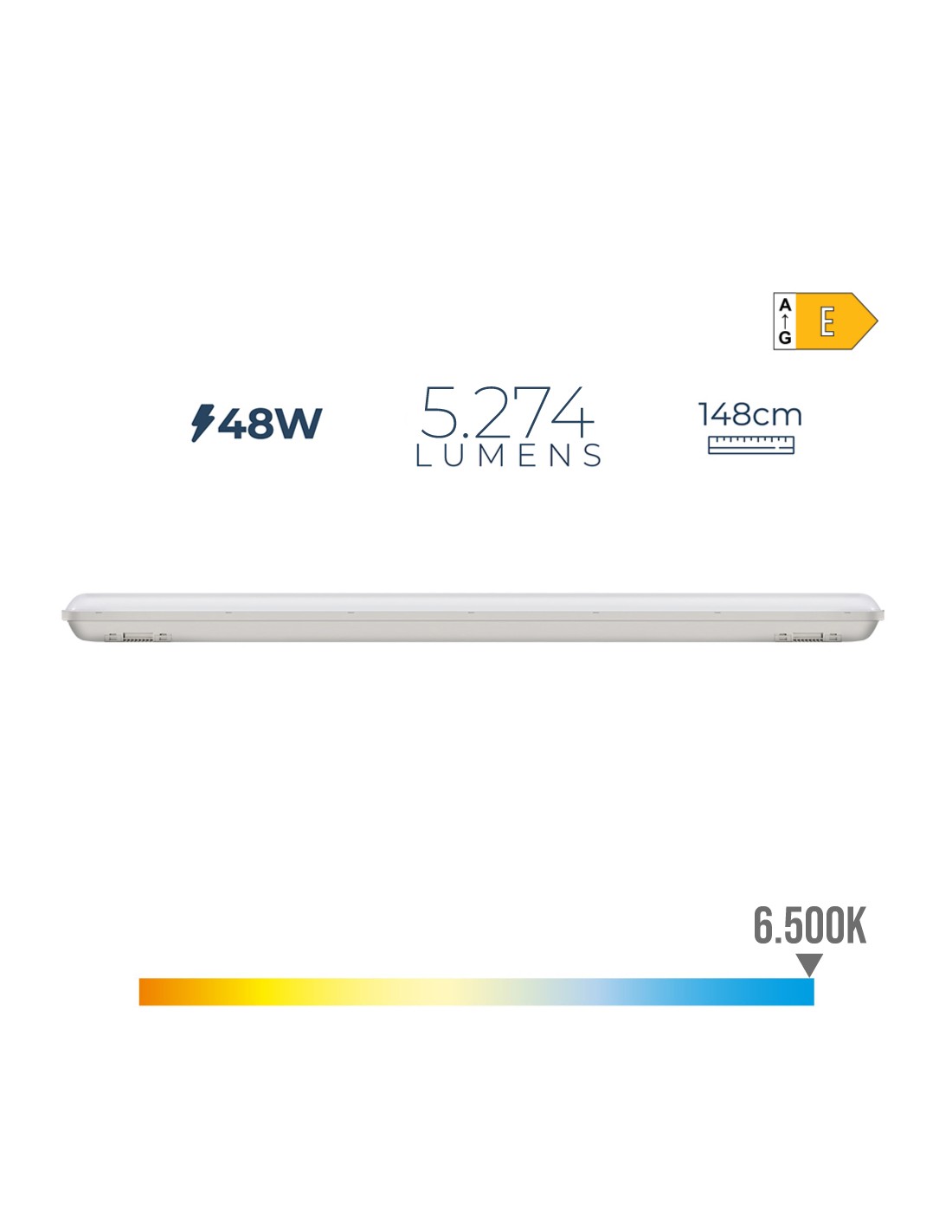 Regleta estanca led ip65 48 w 5274 lm 6500 k luz fria, conectables entre si máximo 8 unidades, 120° con soportes 220-240 v, 25.000 h cumple con normativa ce. ik08. medidas: 8,6 x 148 x 6,6 cm (equivalente 150 cm)