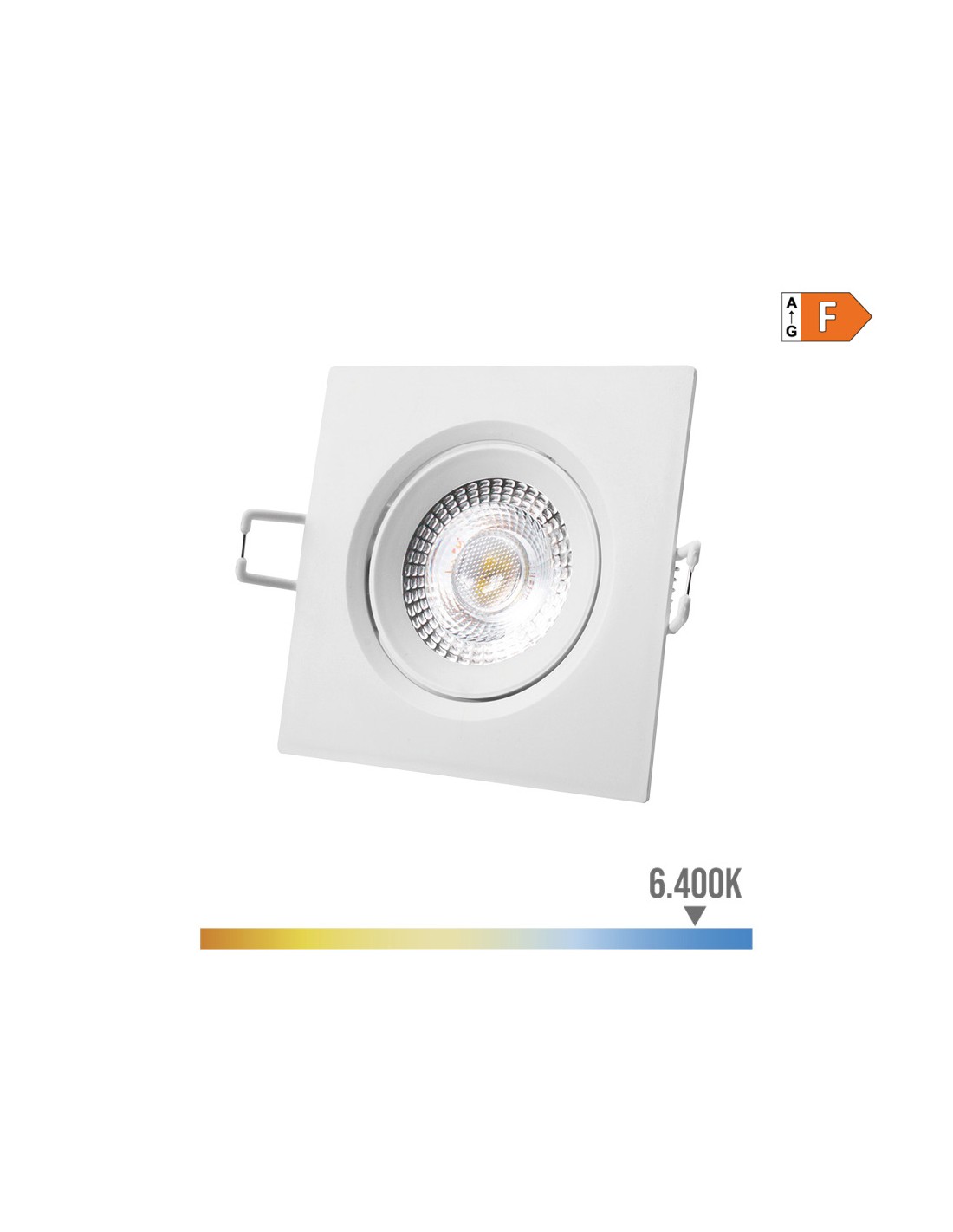 Downlight led empotrable cuadrado 5w 6400k luz fria. color blanco. clase energetica f. 380lm ip20. angulo apertura: 120° medidas: exterior: 9x9cm - enclavamiento: ø7cm 220-240v. 25000h edm