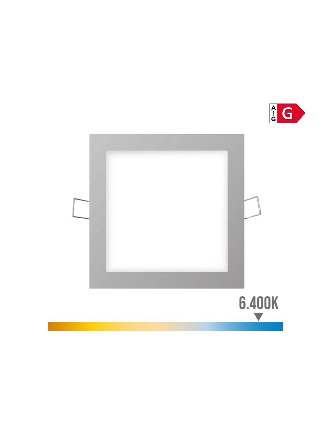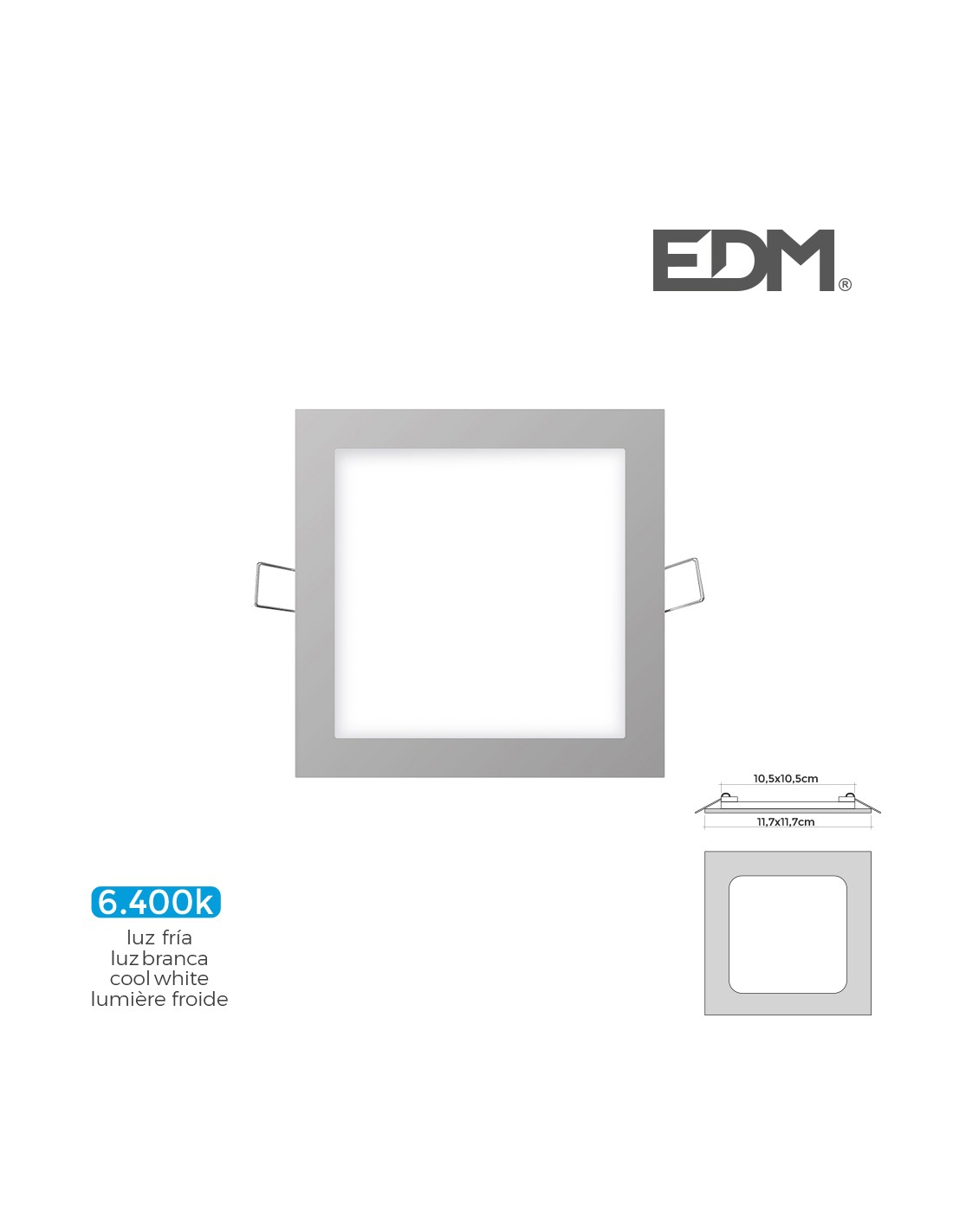 Mini downlight led empotrable cuadrado 6w 6400k luz fria 320lm. color cromo. angulo de apertura: 120°. ip20. clase energetica g. medidas: exterior: 11,7x11,7cm - enclavamiento: 10,5x10,5cm. 220-240v 25.000h edm