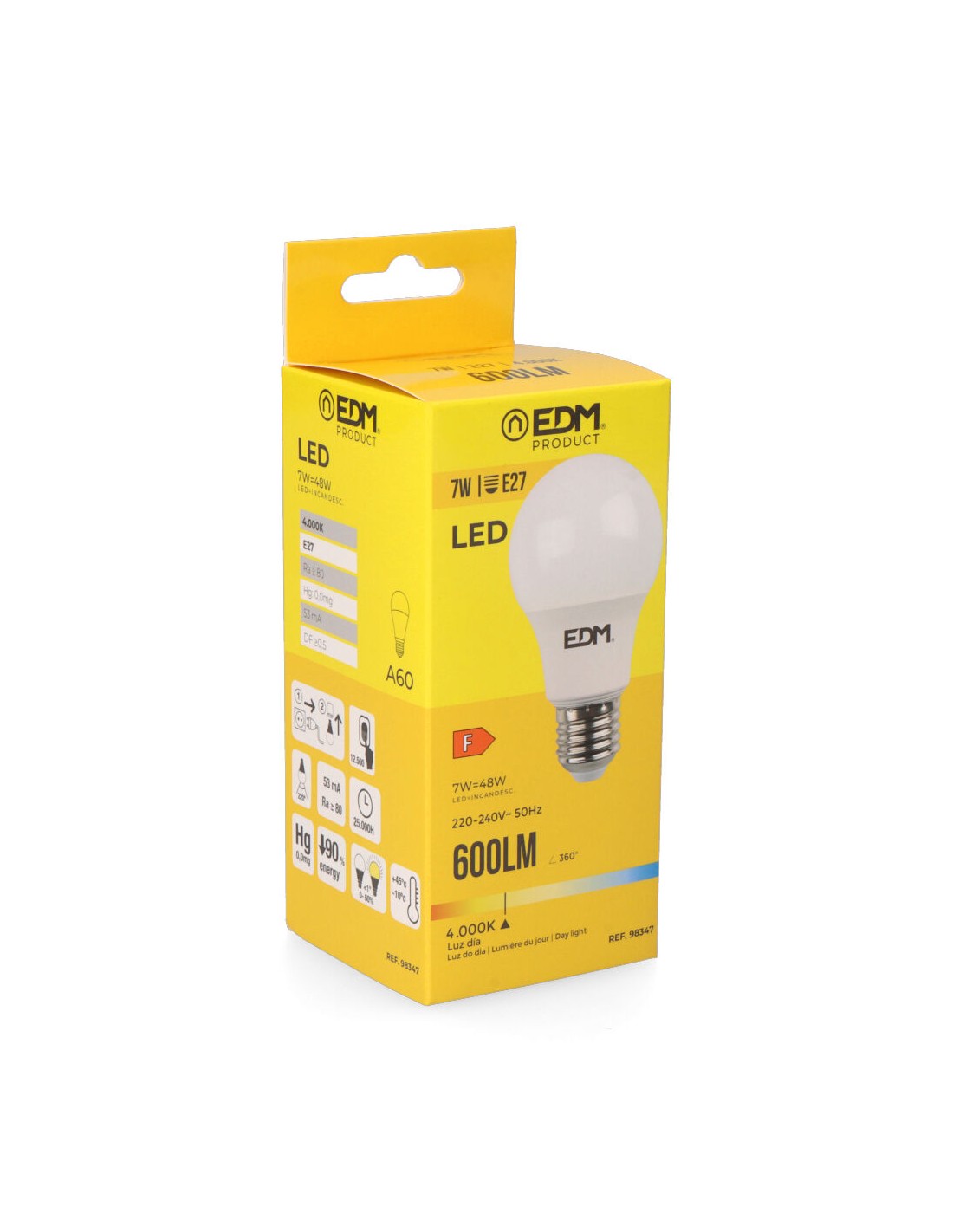 Bombilla standard led e27 7w 600lm 4000k luz dia. medida: ø6x10,8cm (diámetro/alto) 25000h ac 220-240v. clase energetica: f. angulo de apertura: 220° edm