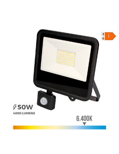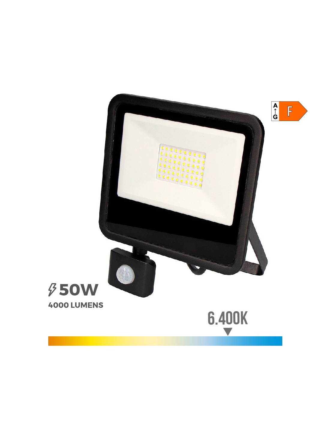 Foco proyector led negro 50 w 4000 lm 6400 k luz fría con sensor de presencia alcance ajustable de 2 a 10m - altura ajustable de 1,8 a 2,5 m - ángulo de apertura del sensor 140°. tiempo de retardo del sensor: mínimo 10 s y un máximo de 8 min. ip65. medidas: 23,8 x 4,5 x 19,2 cm. vida estimada: 25.000 h tensión: 220-240 v. clase energética f. ángulo de apertura: 120°