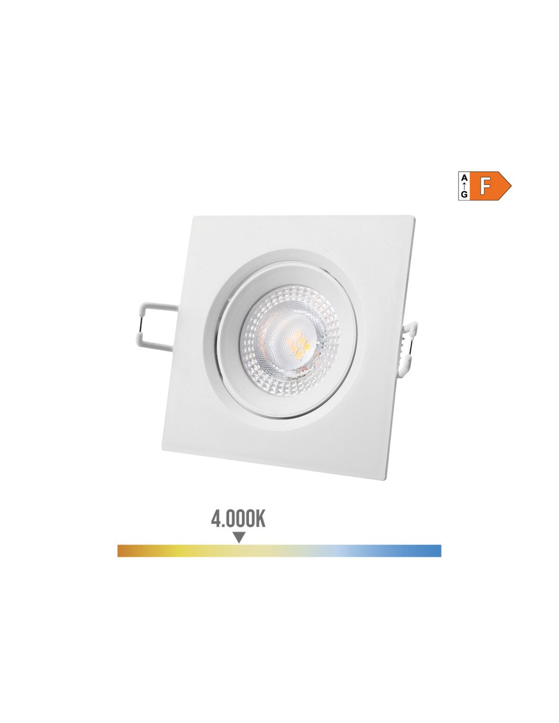Downlight led empotrable cuadrado 5w 4000k luz dia.color blanco. clase energetica f. 380lm ip20. angulo apertura: 120° medidas: exterior: 9x9cm - enclavamiento: ø7cm. 220-240v. 25000h edm