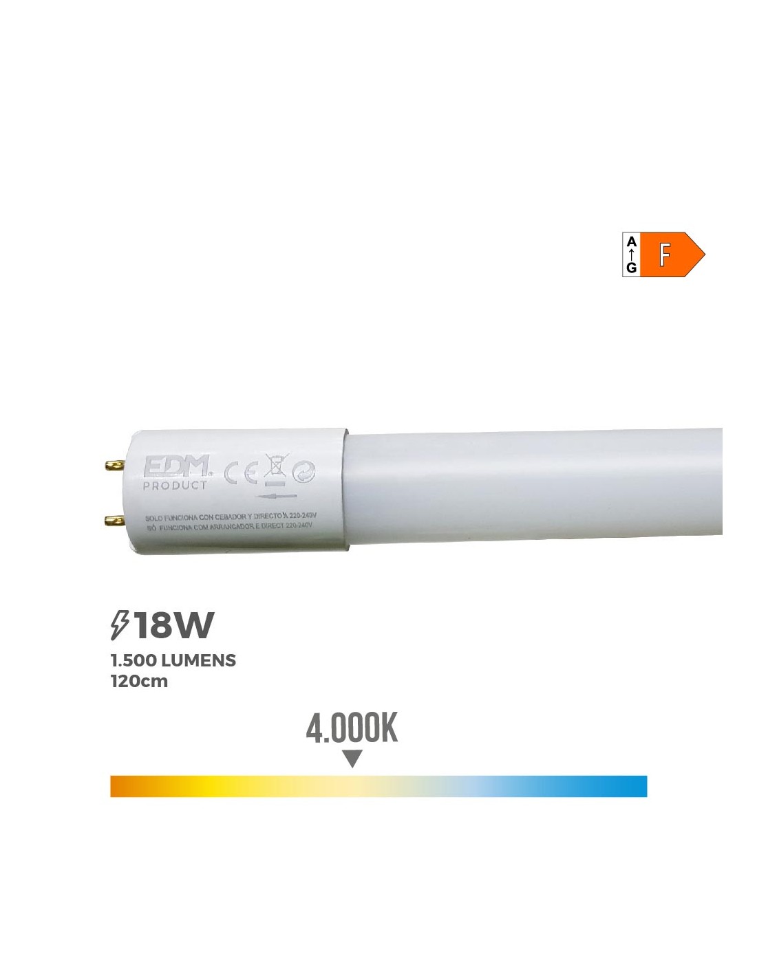 Tubo led t8 18w 1950lm 4000k luz dia (eq.36w) medidas: ø2,6x120cm 25000h ac 220-240v clase energetica: f angulo de apertura: 360° (cebador incluido. conexion directa a 220v) edm