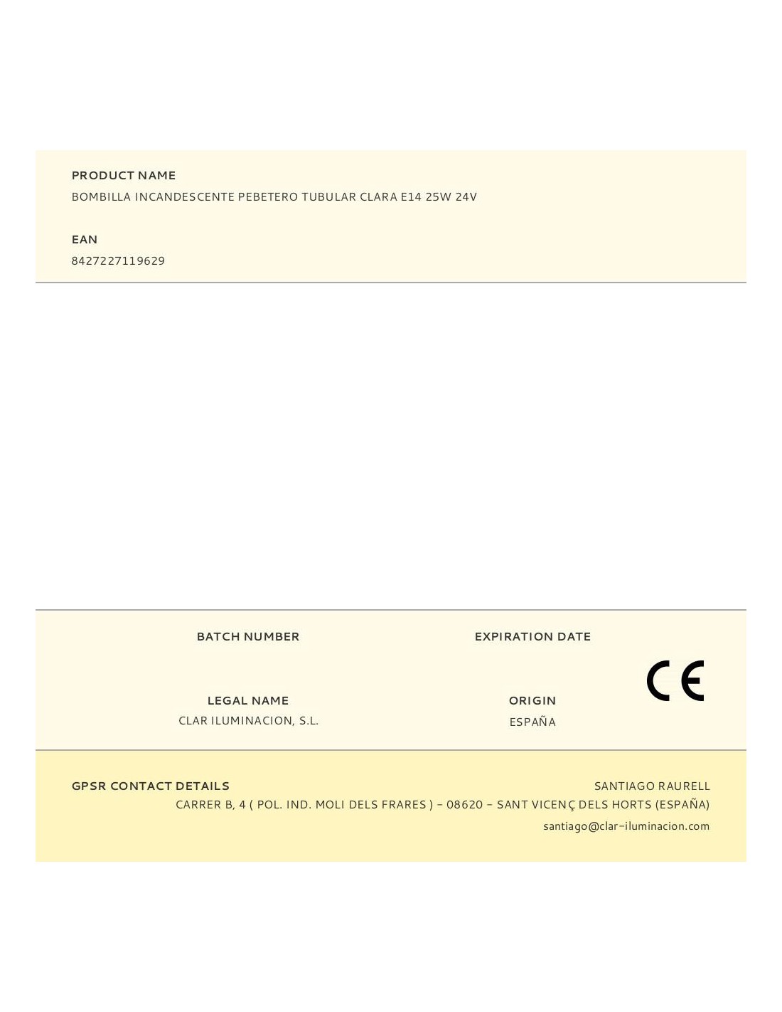 Bombilla incandescente pebetero tubular clara e14 25w 2800k. angulo de apertura: 360°. luminosidad: 200lm. tension: 24v