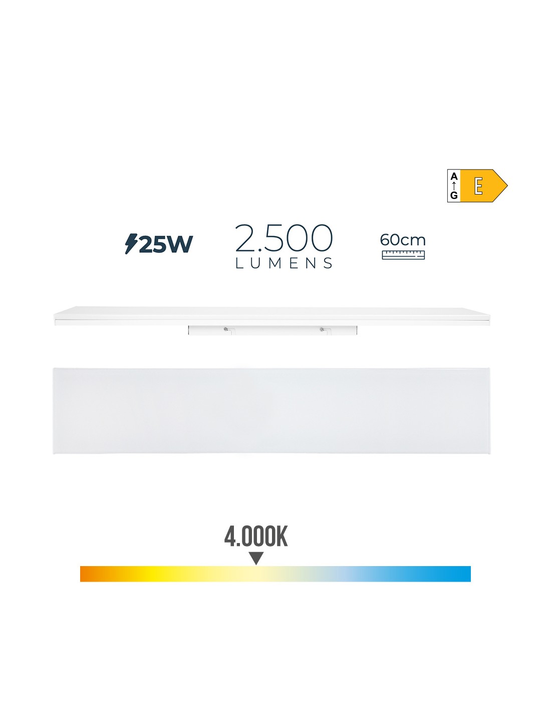 Regleta led 25w 4000k luz dia 2500lm - cantidad de leds 273 - no regulable - angulo de apertura 110° - encendido rápido - sin parpadeo - ra:80 - hg:0,0mg - 190ma - pf0,5 - 220-240v 50hz - ip20 - 25000h - clase e - medidas: 12x60x4,5cm - edm