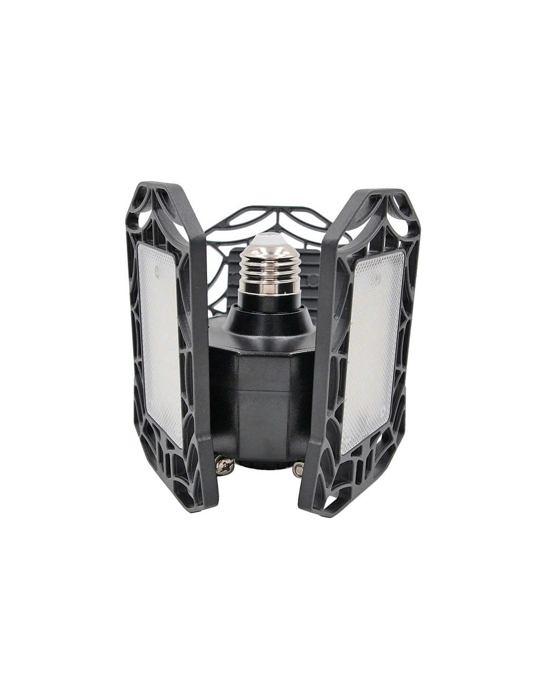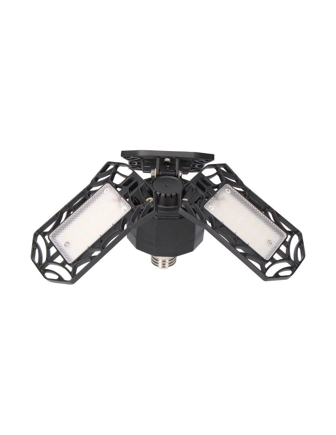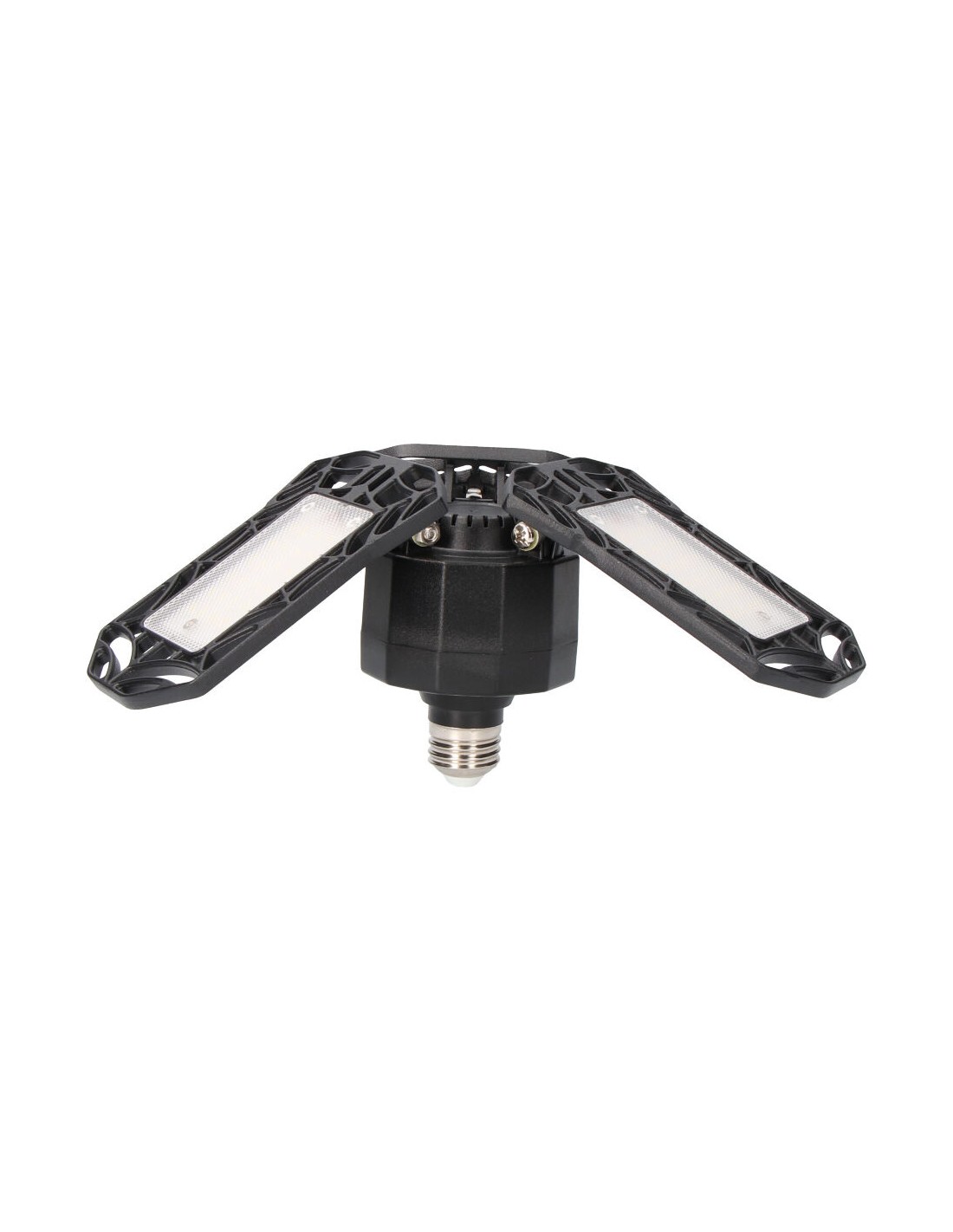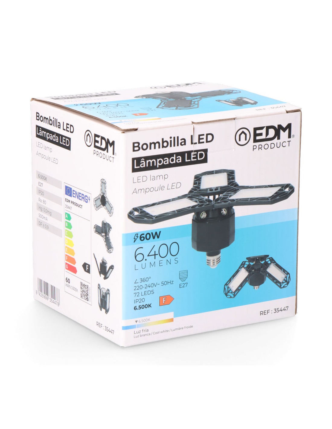 Bombilla "leaf" led e27 60w 6400lm 6500k luz fria edm. esta bombilla esta compuesta por 3 luminarias plegables hasta 90°, grado de apertura de luz 180° a 360° fabricada en plastico y aluminio. ip20, 72 leds, ideal para garajes, almacenes... medidas: ø26,5x12cm 220-240v