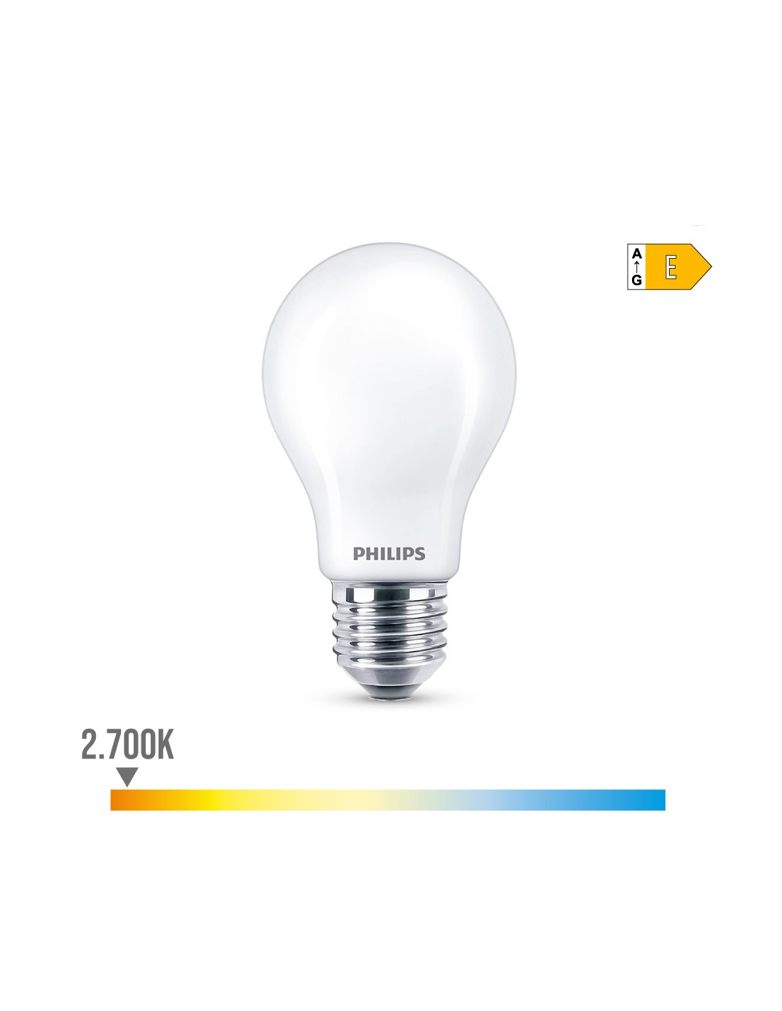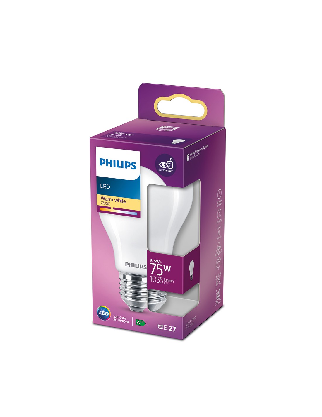 Bombilla standard led e27 8,5w 1.055lm 2700k luz calida. medida: ø6x10,4cm (diámetro/alto) 15000h. ac 220-240v cristal mate, no regulable, irc:80 angulo de apertura 360°. equivalencia: 75w. philips
