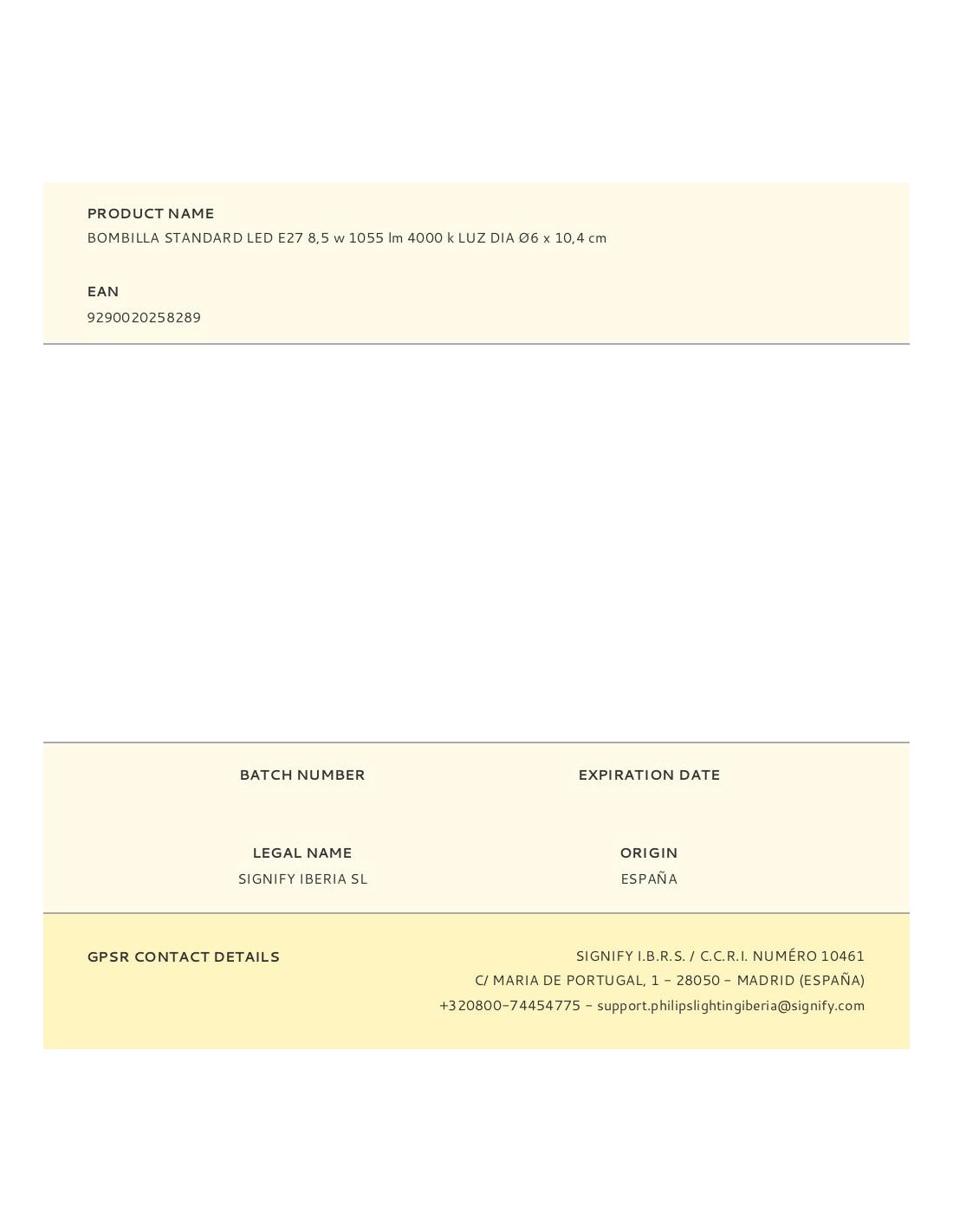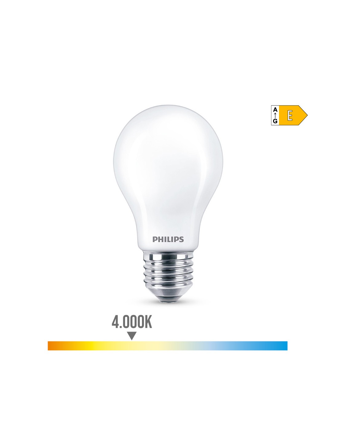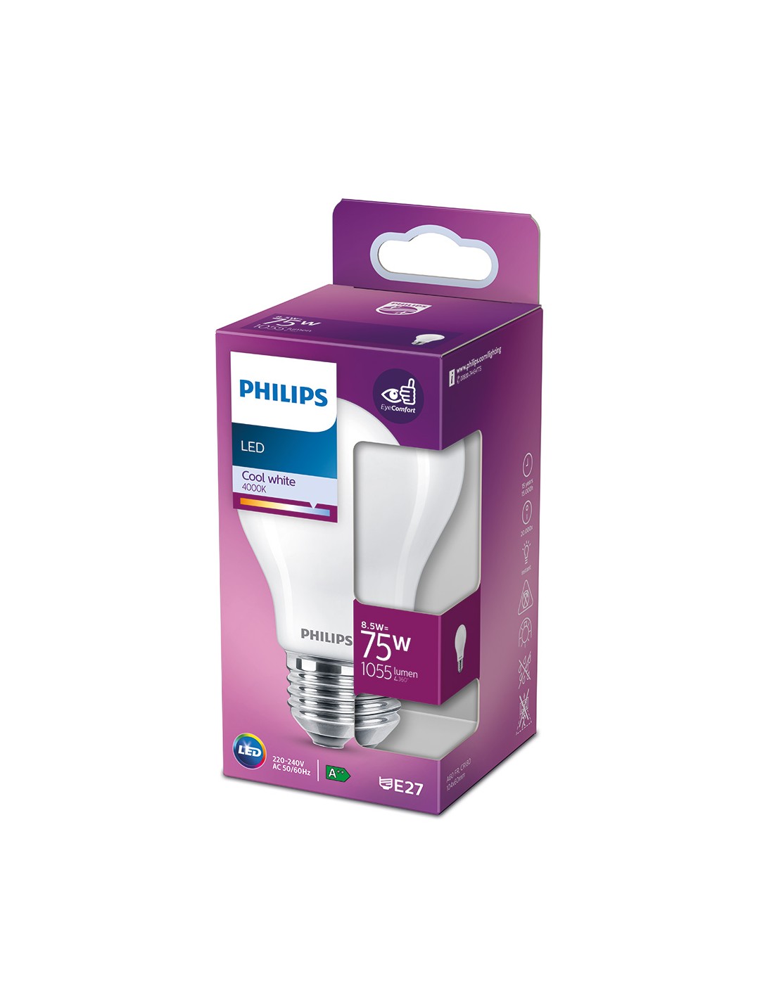 Bombilla standard led e27 8,5w 1.055lm 4000k luz dia. medida: ø6x10,4cm (diámetro/alto) 15000h. ac 220-240v cristal mate, no regulable, irc:80 angulo de apertura 360°. equivalencia: 75w. philips