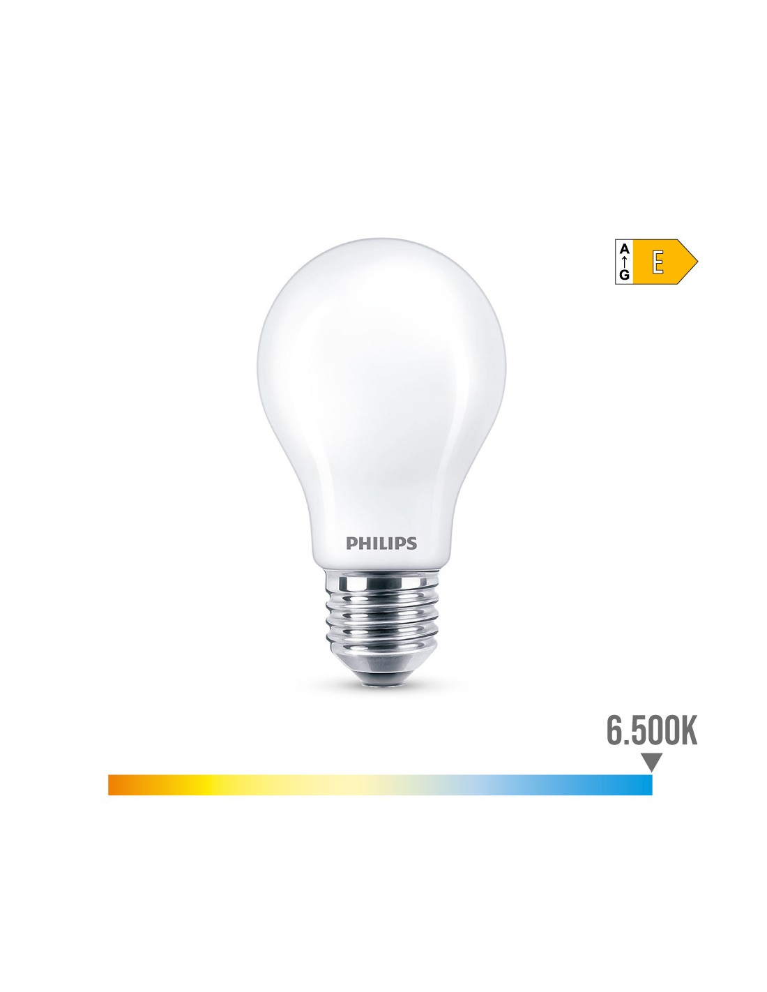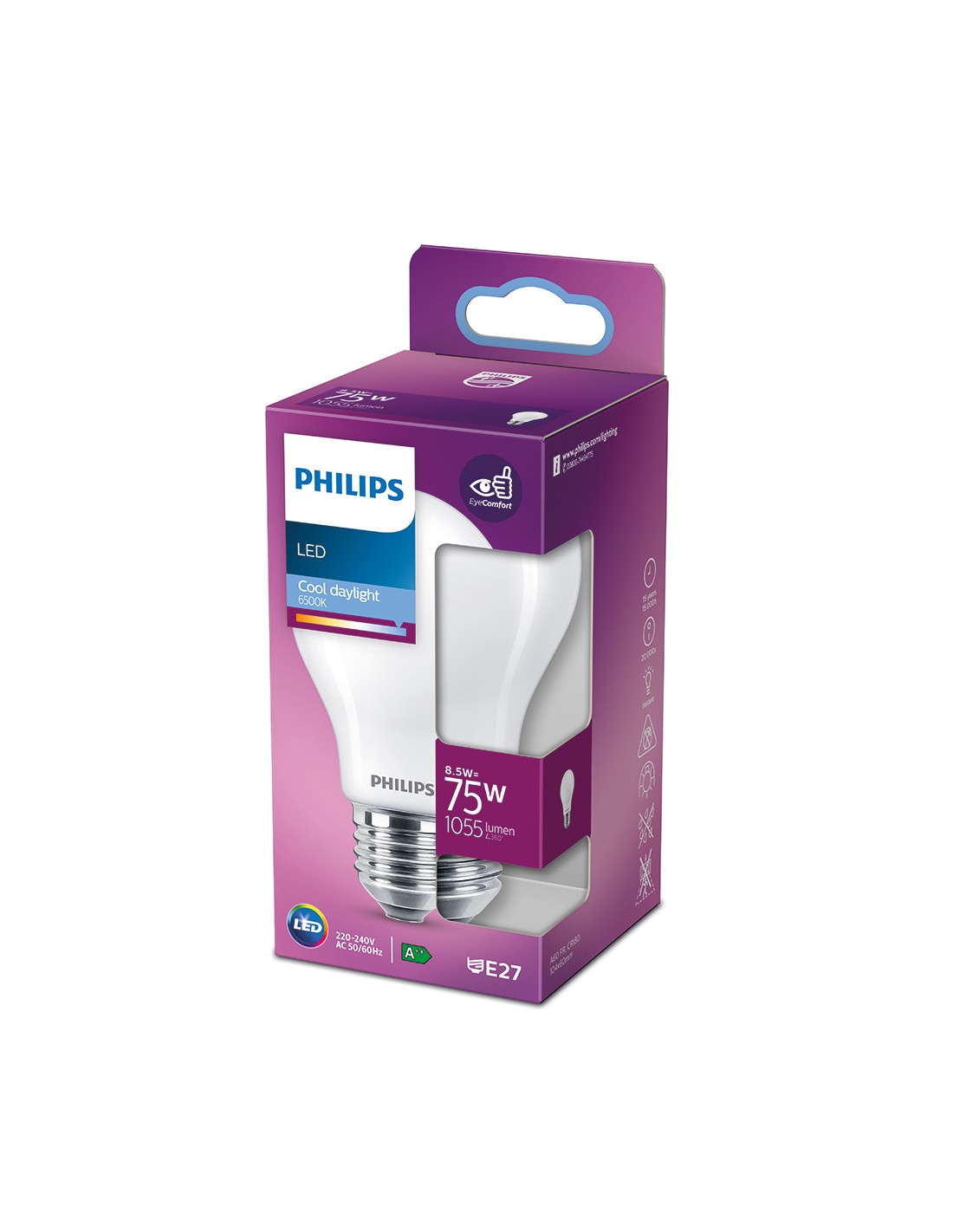 Bombilla standard led e27 8,5w 1.055lm 6500k luz fria. medida: ø6x10,4cm (diámetro/alto) 15000h. ac 220-240v cristal mate, no regulable, irc:80 angulo de apertura 360°. equivalencia: 75w. philips