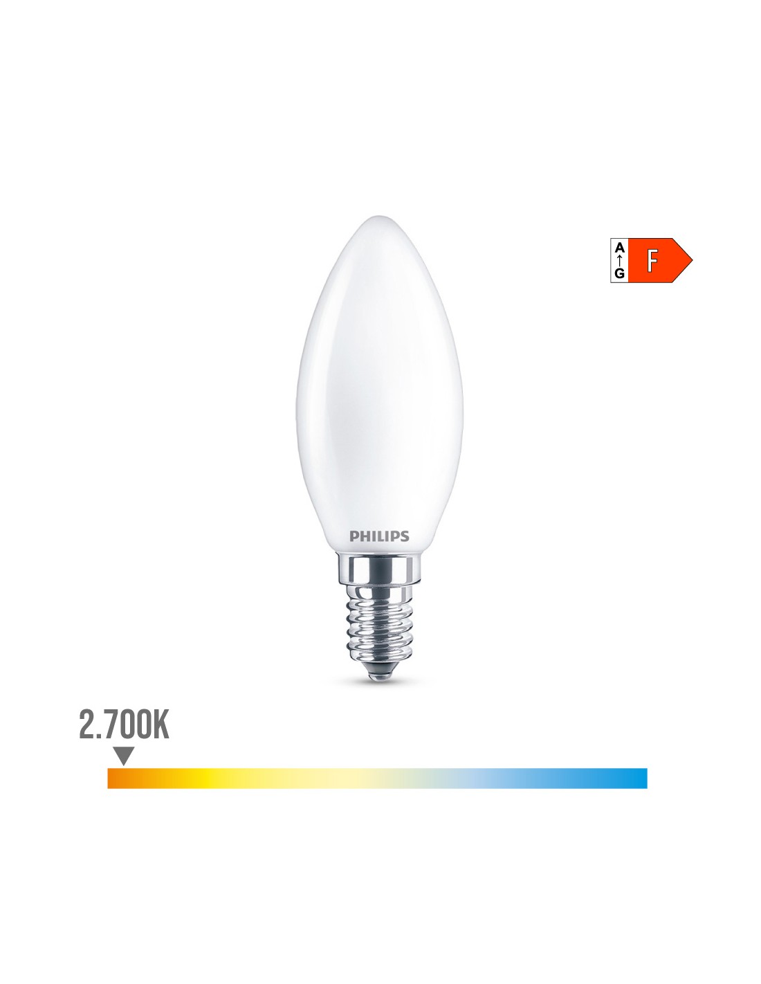 Bombilla vela led e14 4,3w 470lm 2700k luz calida. medida: ø3,5x9,7cm (diámetro/alto) 15000h. ac 220-240v. cristal mate. no regulable. irc: 80. angulo de apertura 360°. equivalencia: 40w. philips