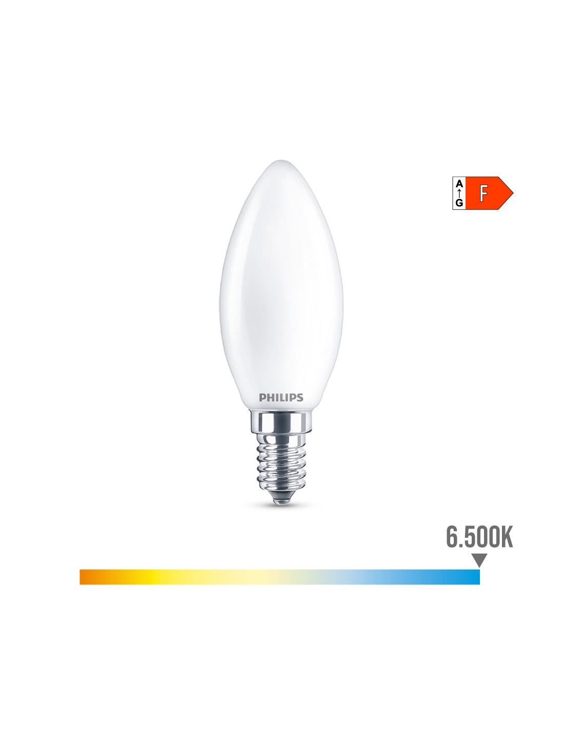 Bombilla vela led e14 4,3w 470lm 6500k luz fria. medida: ø3,5x9,7cm ( diámetro/alto) 15000h. ac 220-240v. cristal mate. no regulable. irc: 80. angulo de apertura 360°. equivalencia: 40w. philips