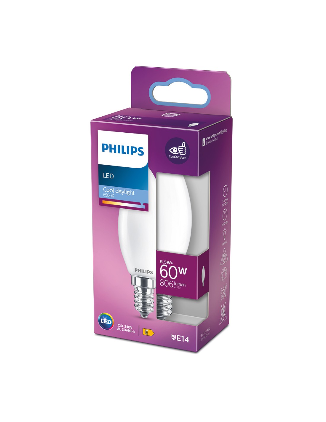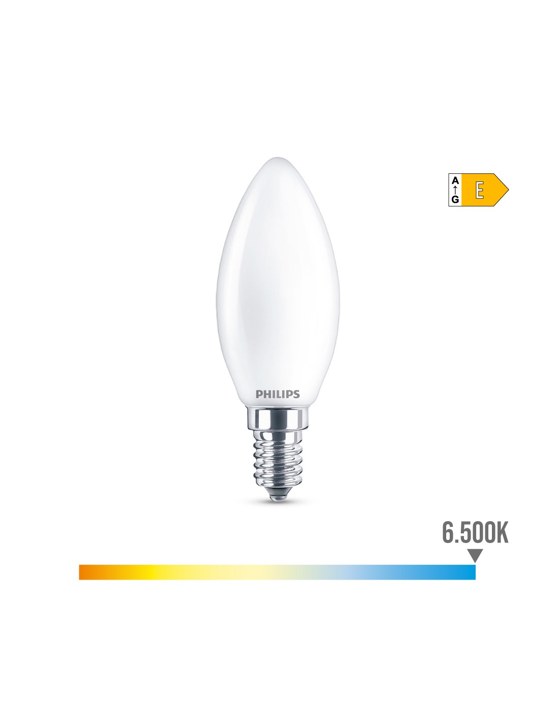 Bombilla vela led e14 6,5w 806lm 6500k luz fria. medida: ø3,5x9,7cm ( diámetro/alto) 15000h. ac 220-240v. . cristal mate. no regulable. irc: 80. angulo de apertura 360°. equivalencia: 60w. philips