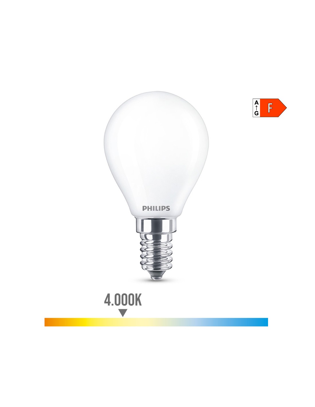 Bombilla esferica led e14 4,3w 470lm 4000k luz dia medida: ø4,5x8,2cm (diámetro/alto) 15.000h, ac 220-240v . cristal mate, no regulable, irc:80. angulo de apertura 360° equivalencia: 40w. philips