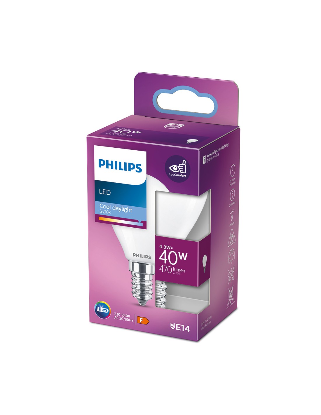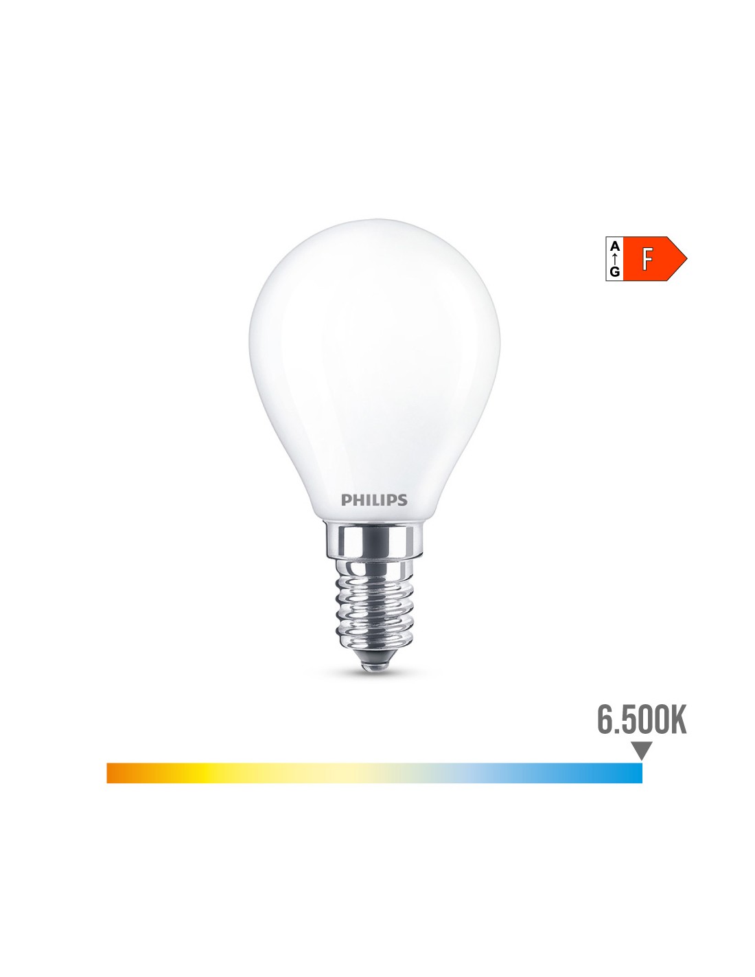 Bombilla esferica led e14 4,3w 470lm 6500k luz fria medida: ø4,5x8,2cm (diámetro/alto) 15.000h, ac 220-240v cristal mate, no regulable, irc:80. angulo de apertura 360° equivalencia: 40w. philips
