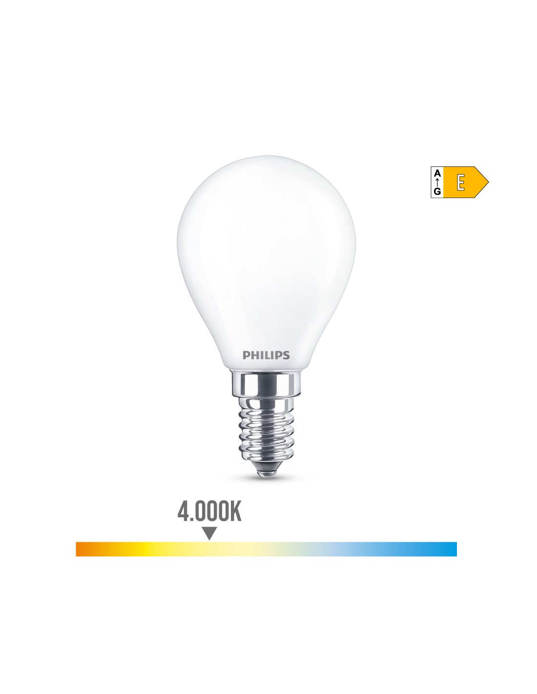 Bombilla esferica led e14 6,5w 806lm 4000k luz dia: ø4,5x8cm (diámetro/alto) 15000h, ac 220-240v cristal mate, no regulable, irc:80. angulo de apertura 360°. equivalencia: 60w. philips