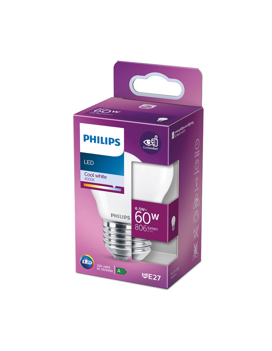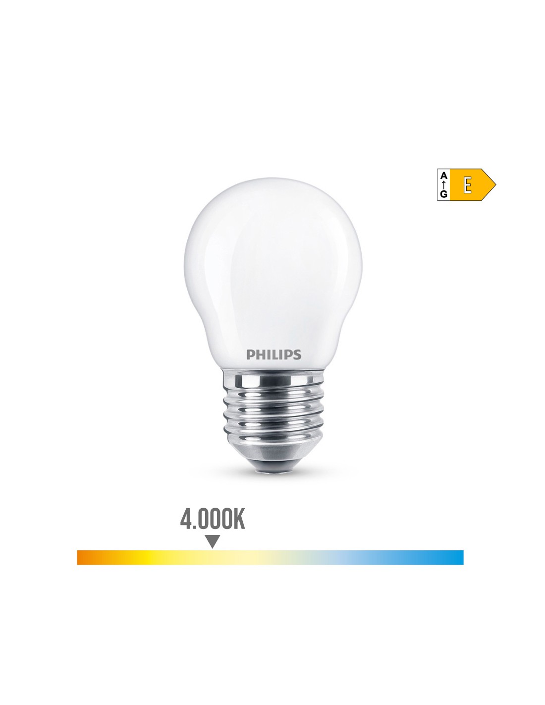 Bombilla esferica led e27 6,5w 806lm 4000k luz dia medida: ø4,5x7,8cm (diámetro/alto) 15000h, ac 220-240v cristal mate, no regulable, irc:80 angulo de apertura 360° equivalencia: 60w. philips