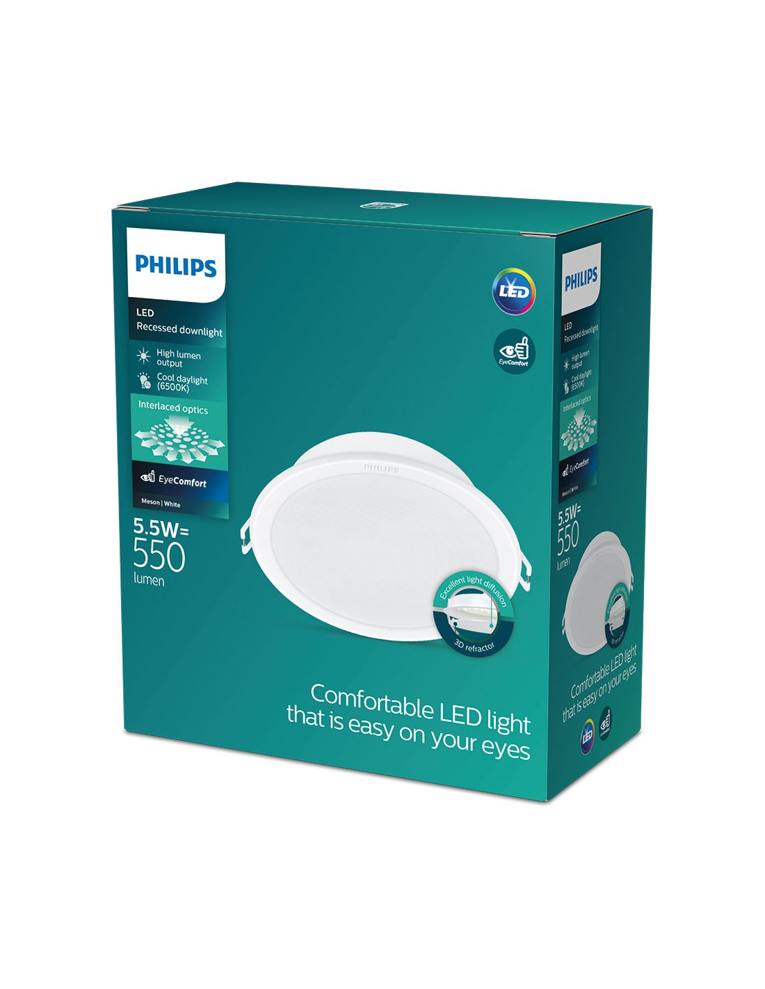 Downlight de empotrar de led 5,5w 550lm 6500k luz fria mod. meson. fabricado en plastico, color blanco, 15000h. angulo apertura 110° , irc80, no regulable medidas: ø9x3,5cm (diámetro/alto) enclavamiento ø8cm. grado de proteccion: ip20. + tension: 220-240v. philips
