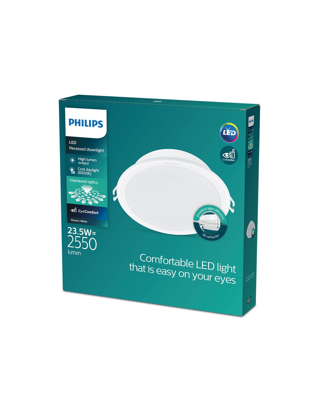Downlight de empotrar de led 23,5w 2550lm 6500k luz fria mod. meson. fabricado en plastico, color blanco, 15000h. angulo apertura 110° , irc80, no regulable medidas: ø21,5x10,5cm (diámetro/alto) enclavamiento ø20cm. grado de proteccion: ip20. + tension: 220-240v. philips