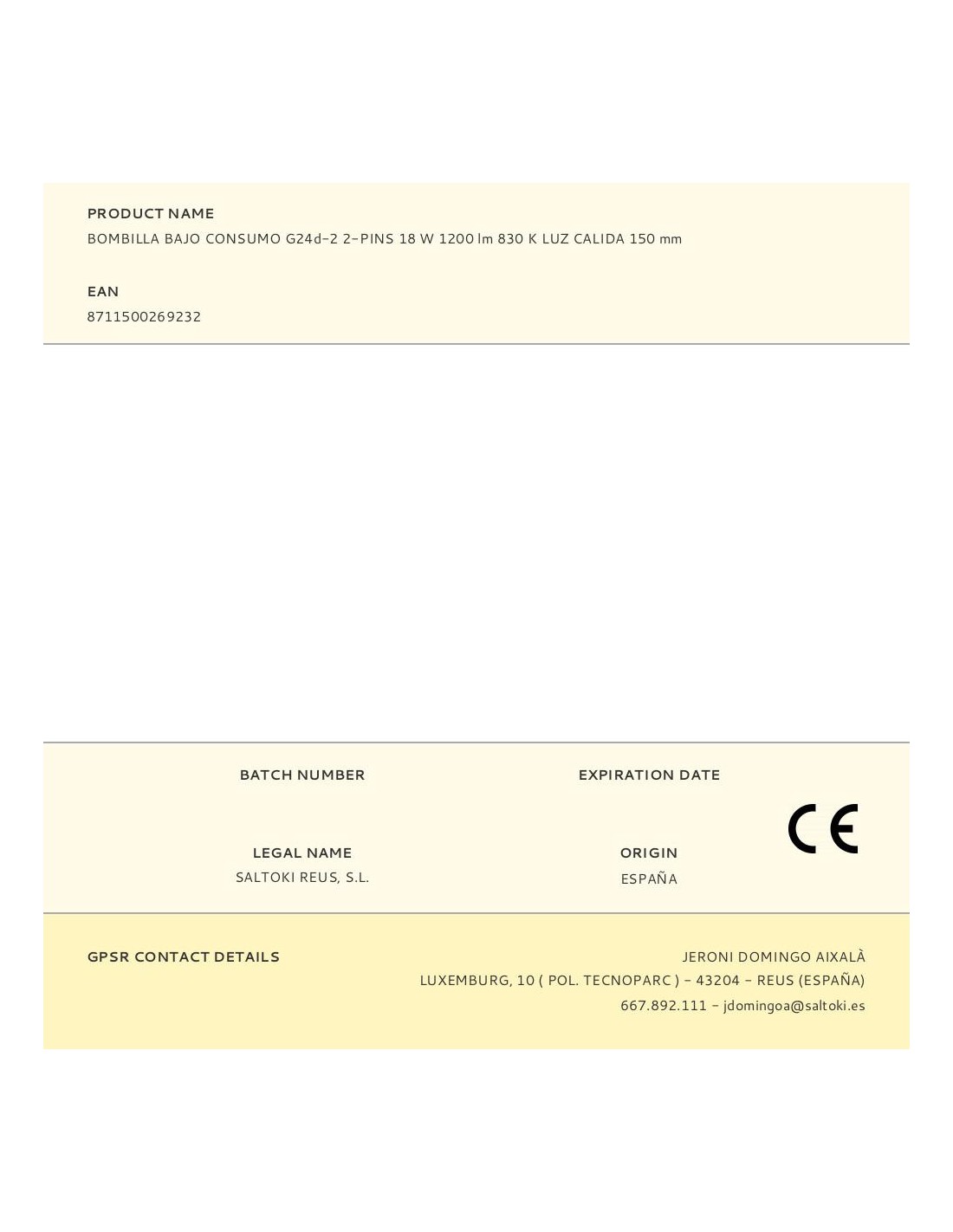 Bombilla bajo consumo 18w 2 pins g24d-2 830k luz calida. 1200lm. medidas: 150x27mm. clase energetica: b. equivalencia: 90w. 10000h. tension: 220-240v basics
