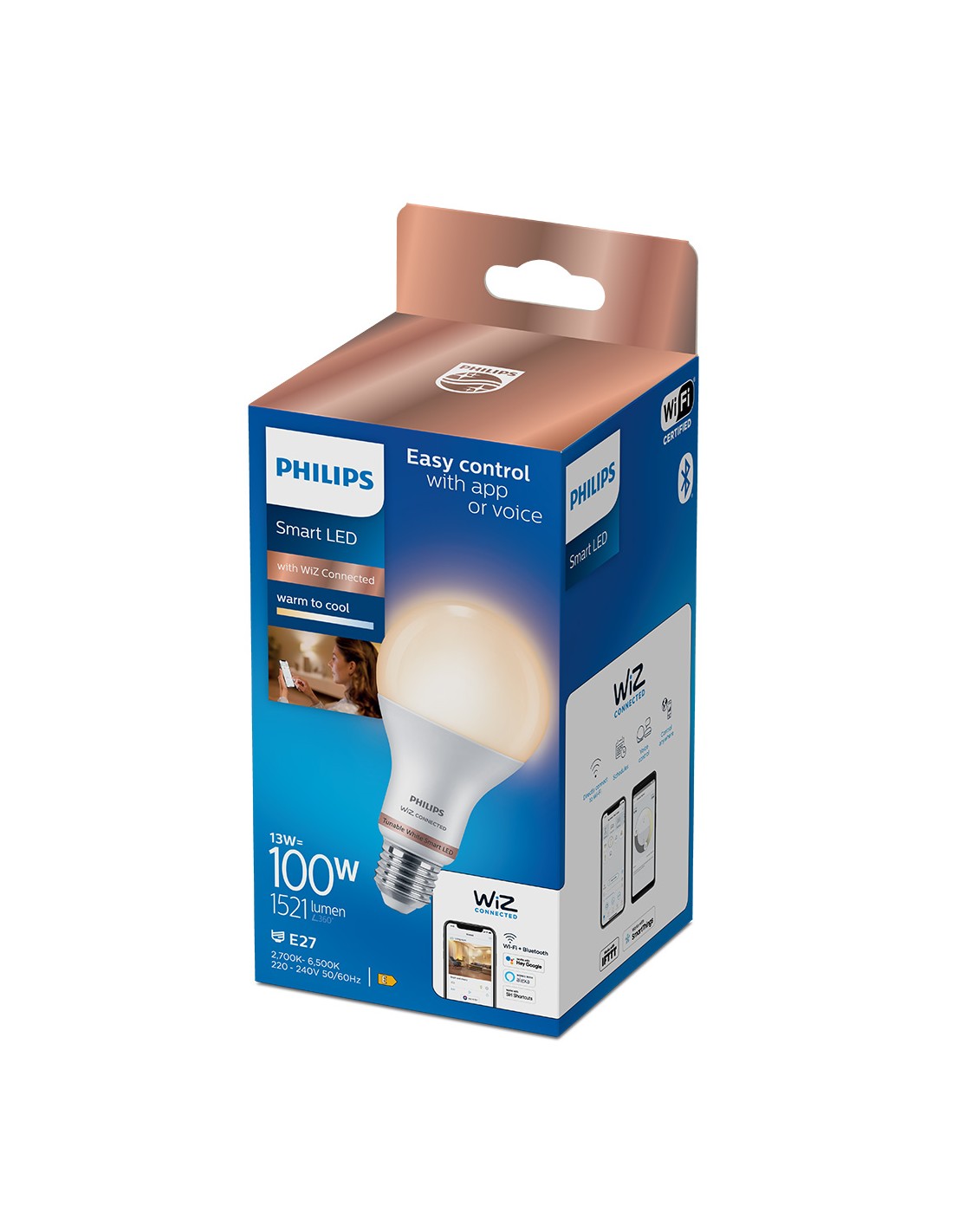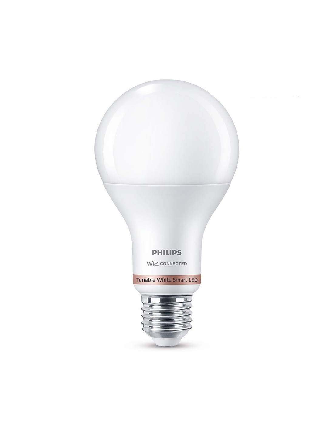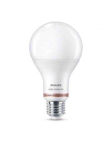 Bombilla led standard e27 13w 2700k-6500k 1521lm wifi philips wiz. la bombilla a67 philips smart led de alta luminosidad ofrece tonos de luz blanca cálida o fría para los accesorios estándar de tu hogar. esta bombilla se conecta a wiz. úsala con tu wifi para controlarla con la aplicación wiz o con tu propia voz.
