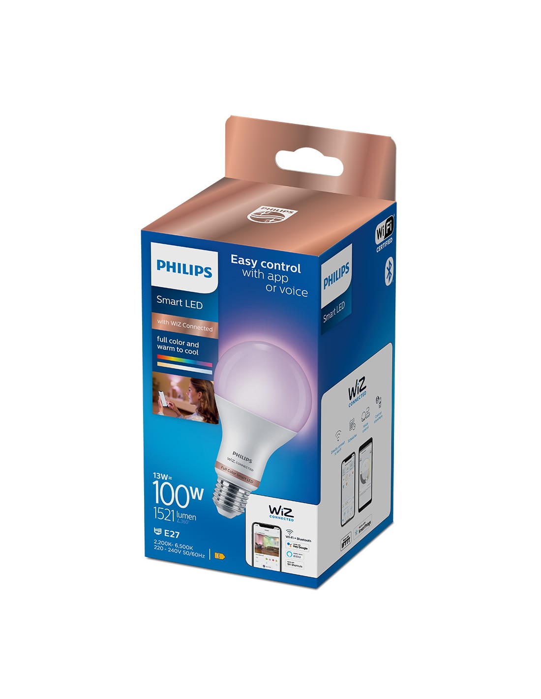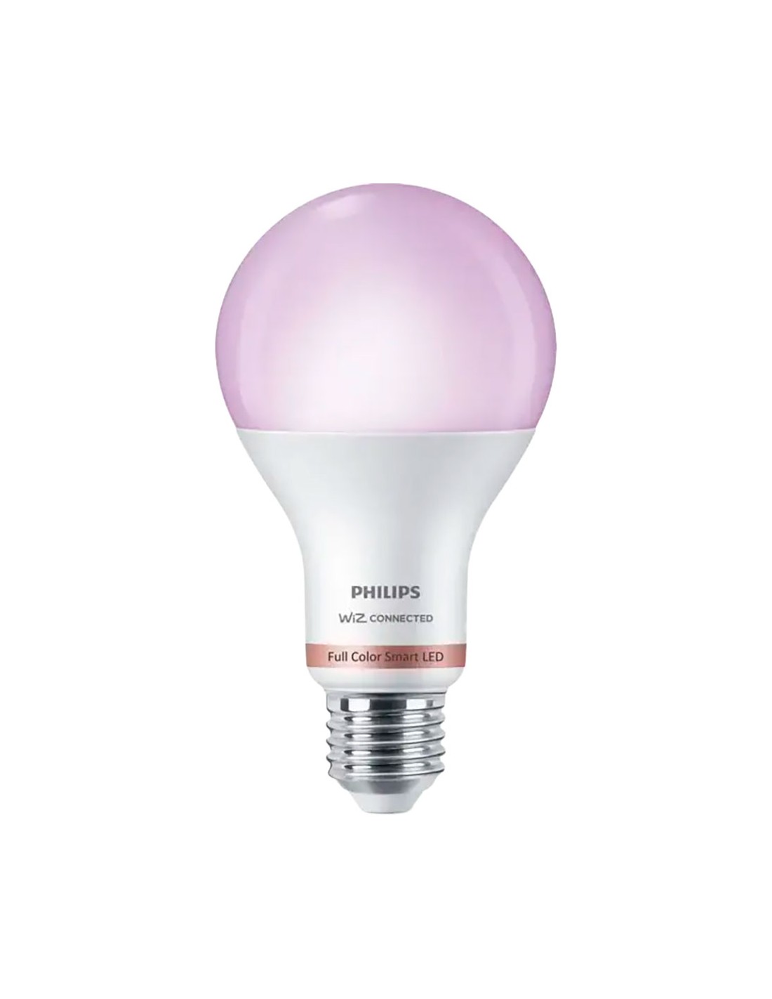 Bombilla led standard e27 13w full colors 1521lm wifi philips wiz. la bombilla a67 philips smart led ofrece luz con una amplia gama de colores y alta luminosidad para los accesorios estándar de tu hogar. esta bombilla se conecta a wiz. úsala con tu wifi para controlarla con la aplicación wiz o con tu propia voz.