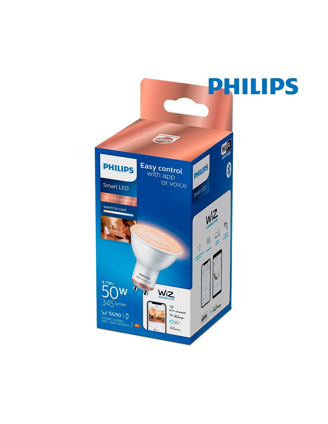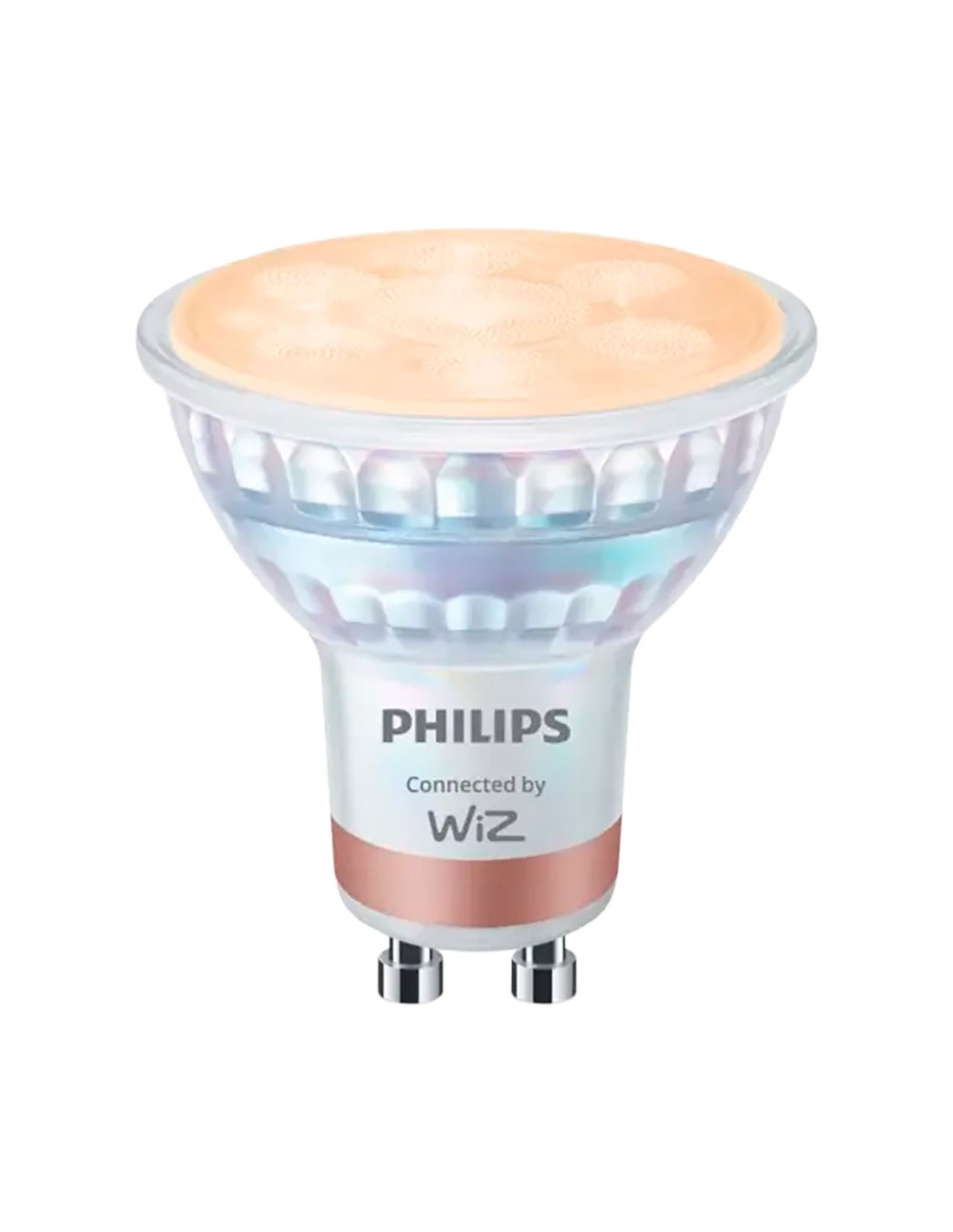Bombilla led gu10 4,7w 2.700k-6.500k 345lm wifi philips wiz. consigue una luz inteligente blanca cálida o fría regulable y difusa en las luminarias y los focos empotrados estándar de tu hogar con la bombilla gu10 philips smart led. esta bombilla se conecta a wiz. úsala con tu wifi para controlarla con la aplicación wiz o con tu propia voz.