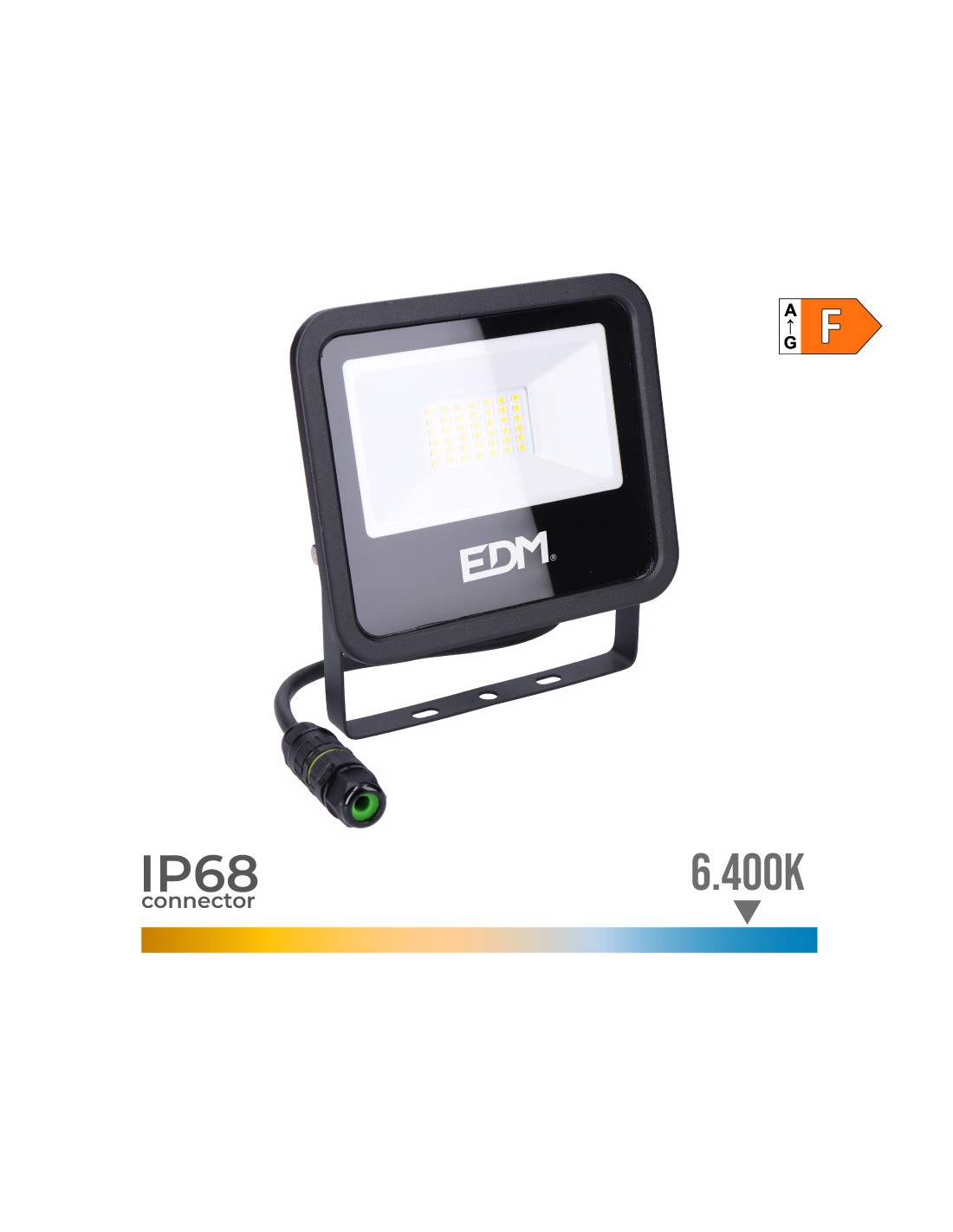 Foco proyector led 30 w 2370 lm 6400 k luz fría ip65 42 leds 15,8 x 13,5 x 2,9 cm vida estimada: 25.000 h 220 - 240 v 50 hz clase energética: f, ángulo de apertura: 120°. incluye conector de cables estanco ip68. black series