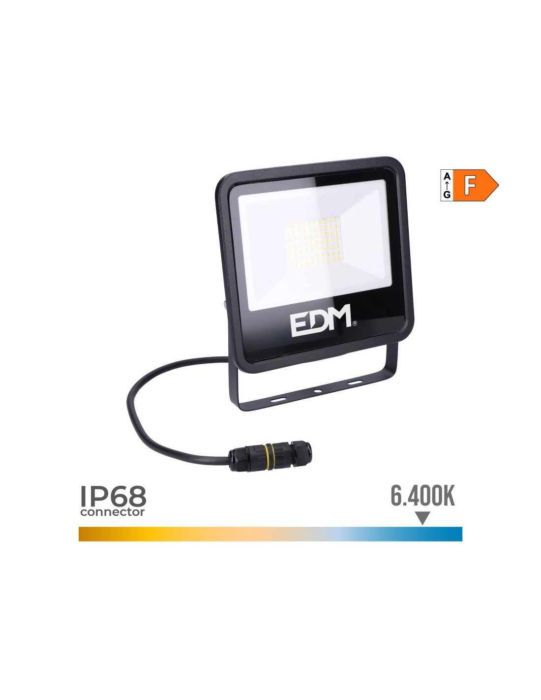 Foco proyector led 50 w 4000 lm 6400 k luz fría ip65 70 leds 19,2 x 17,5 x 2,9 cm vida estimada: 25.000 h 220 - 240 v 50 hz. clase energética: f. ángulo de apertura: 120° incluye conector de cables estanco ip68. black series