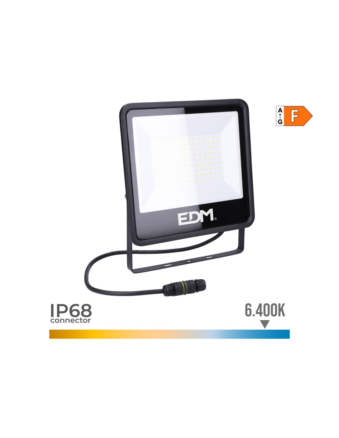Foco proyector led 100 w 8200 lm 6400 k luz fría ip65 126 leds 24,6 x 22,8 x 2,9 cm vida estimada: 25.000 h 220-240 v 50 hz clase energética: f. ángulo de apertura: 120° incluye conector de cables estanco ip68. black series